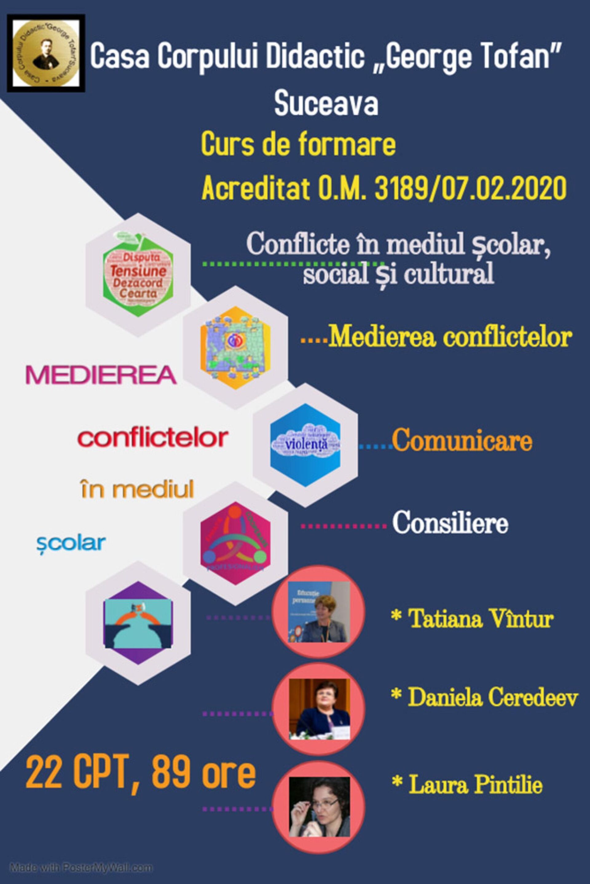 Casa Corpului Didactic (CCD) „George Tofan” Suceava organizează, începând cu 25 ianuarie, Cursul de formare „Medierea conflictelor în mediul școlar” (Conflicte în mediul școlar, social și cultural; Medierea conflictelor, Comunicare, Consiliere), pentru profesori.