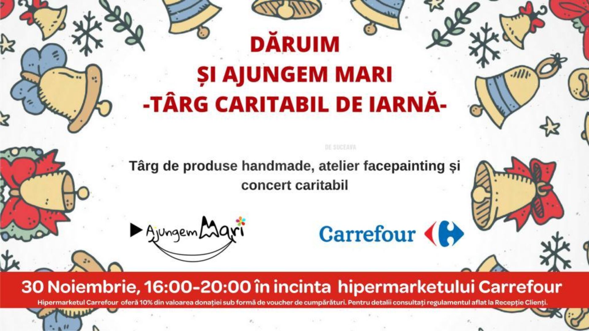 Pe 30 noiembrie, între orele 16:00 și 20:00, la Carrefour, sucevenii pot cumpăra cadouri hand-made realizate de copii, cu ajutorul voluntarilor, pot asculta muzică live cântată de prietenii voluntarilor, iar cei mici pot participa la ateliere creative susținute cu drag de voluntarii „Ajungem MARI”.