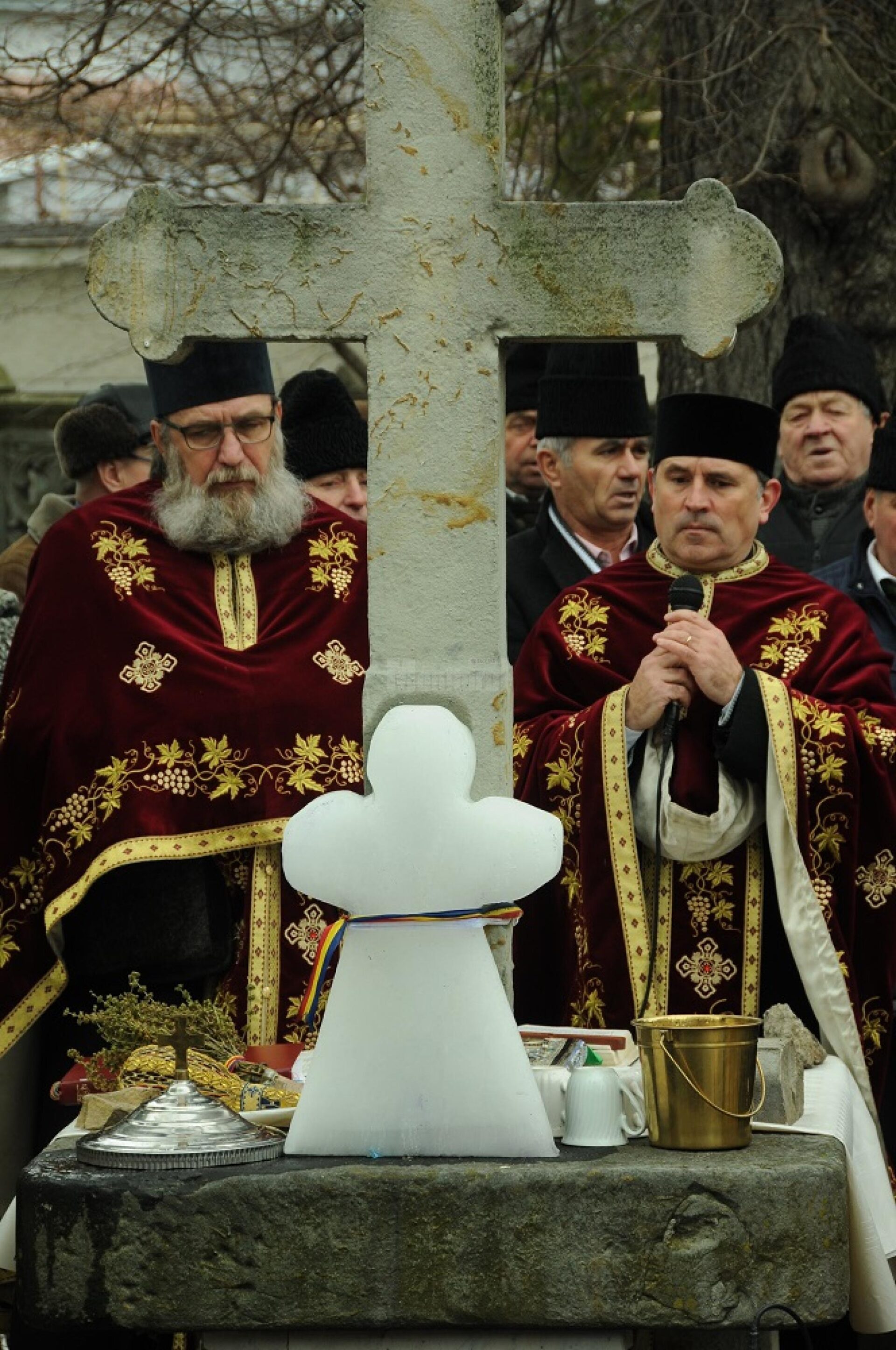 Sute de vase cu apă, aduse de acasă de credincioși, s-au adunat în jurul crucii de gheață, subțiată peste noapte de temperaturile nefiresc de mari, pentru a lua Agheasma Mare.