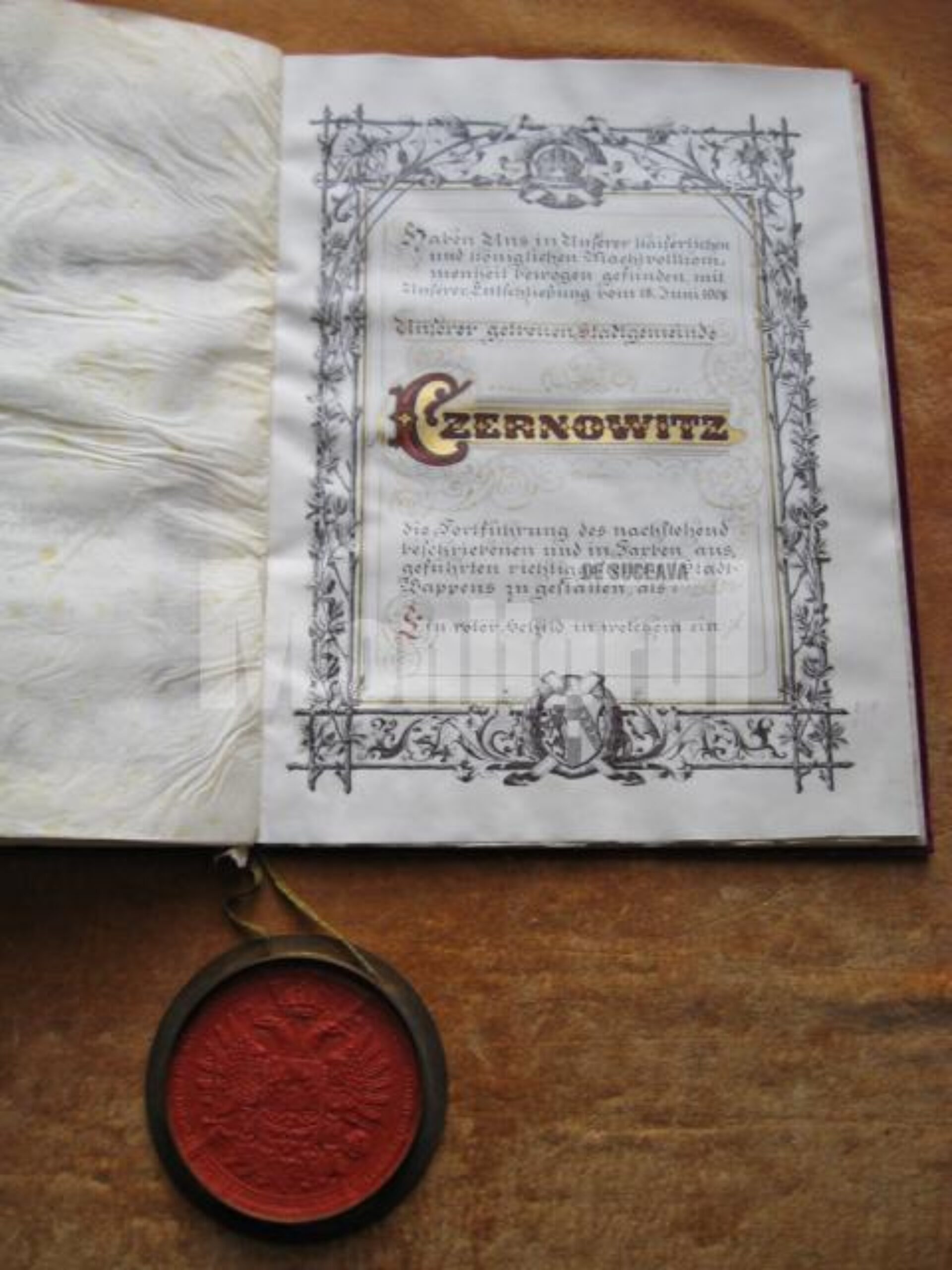 Emis la Viena la data de 18 iunie 1908, decretul-ordin imperial prezintă pe fila 3 stema policromă a orașului Cernăuți, avându-l ca autor de machetă pe F. Junginger.