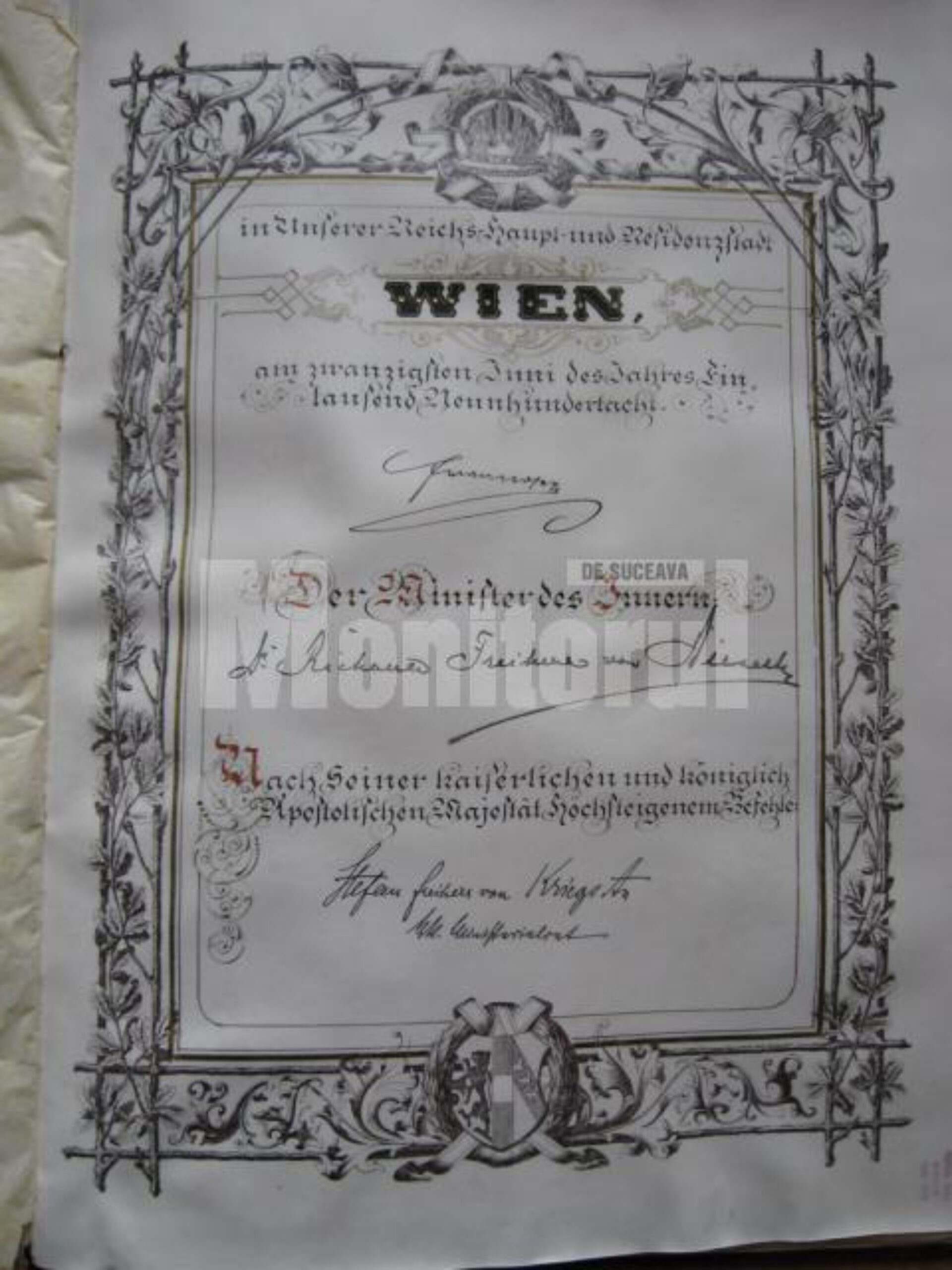 Ultima filă poartă semnătura împăratului Franz Joseph (cârmuitorul absolut al imperiului între anii 1867 – 1916), precum și a Ministrului de Interne.