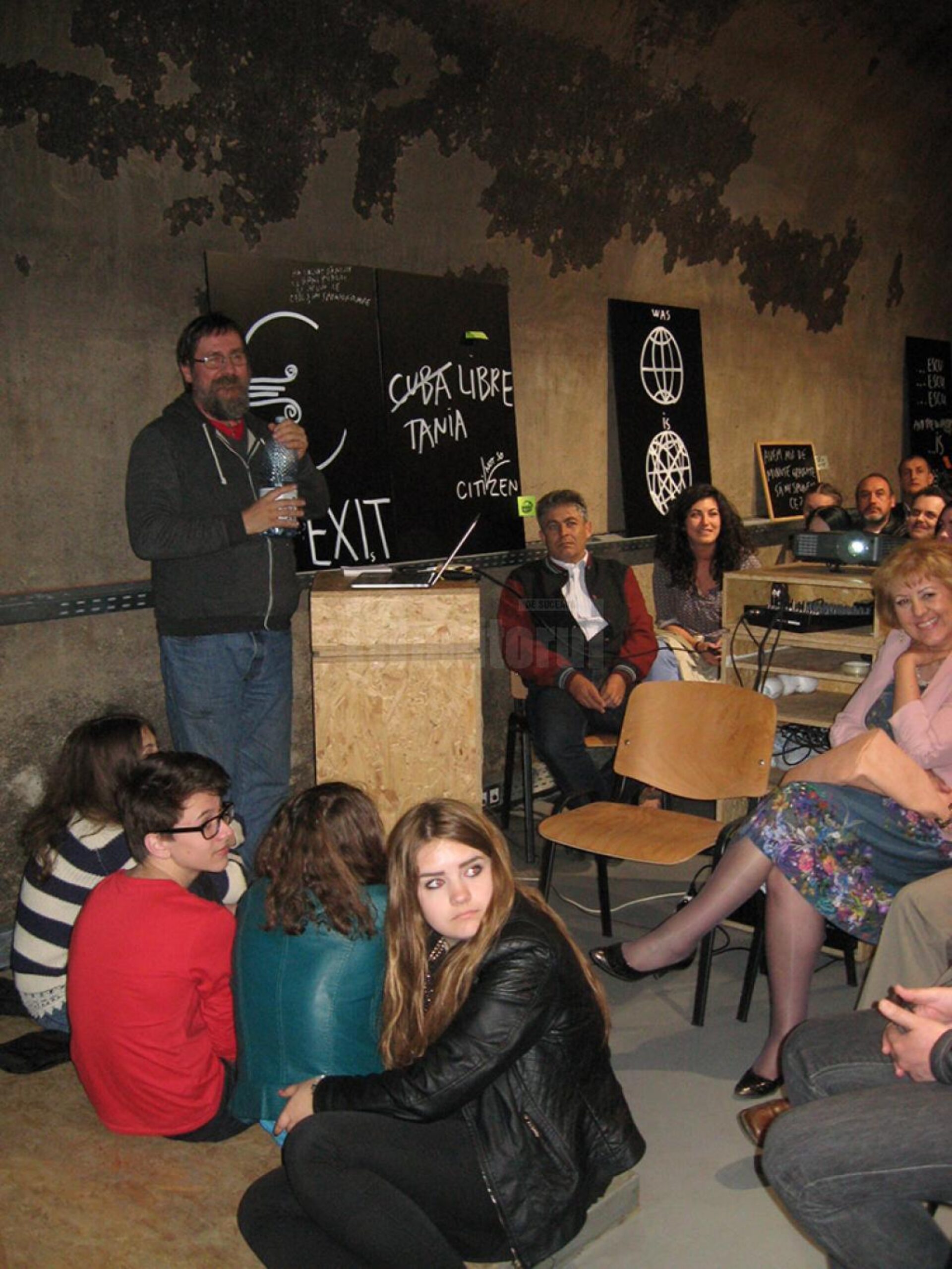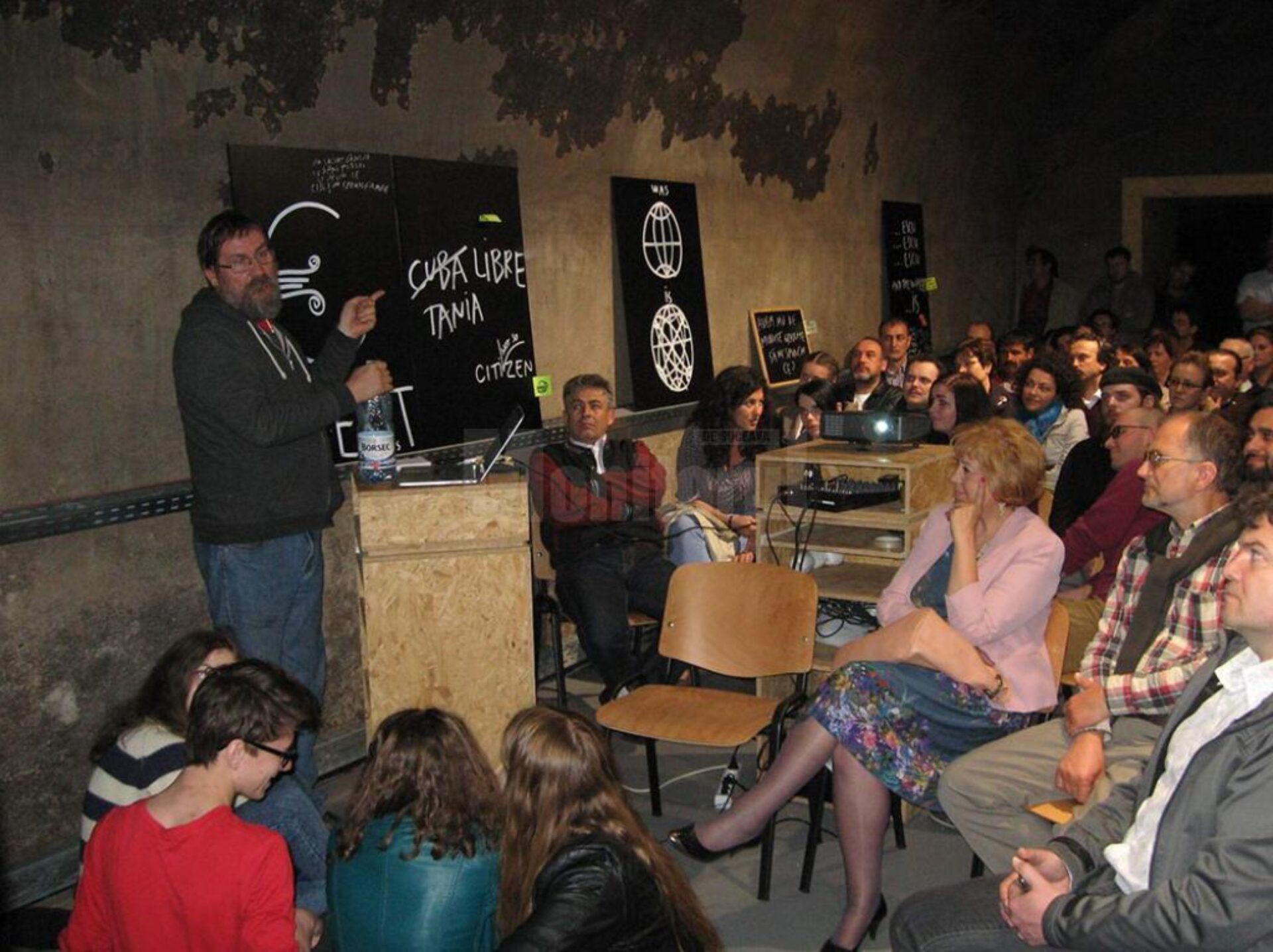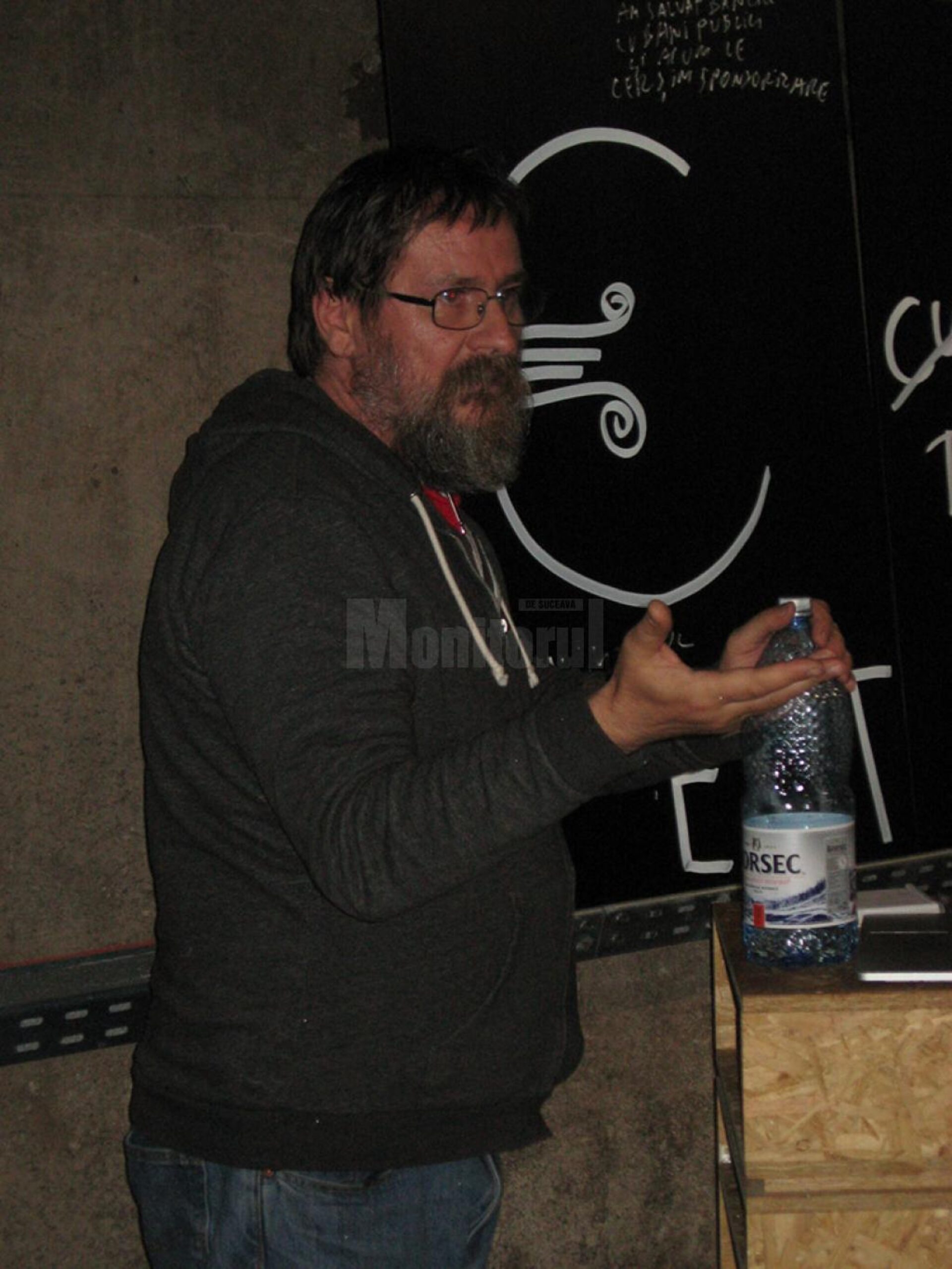 Degajat și colocvial, Dan Perjovschi („un prieten bun care răspunde de oriunde din lume oricărei provocări”, așa cum a spus Simona Nastac) a remarcat mai întâi „spațiul unic” al „Uzinei de Apă” Suceava, „un container cu foarte mare personalitate”, care oferă multă libertate de expresie.
