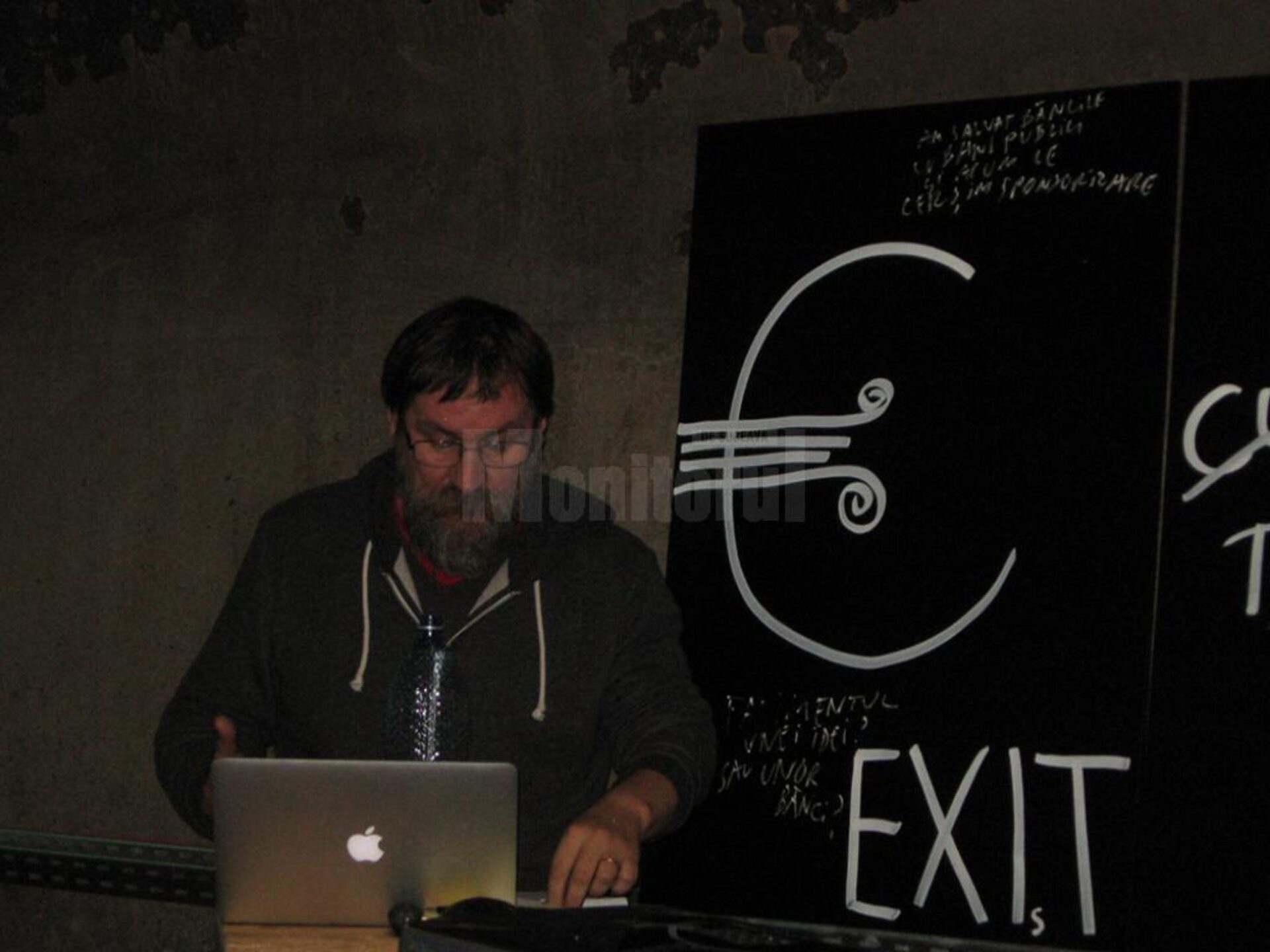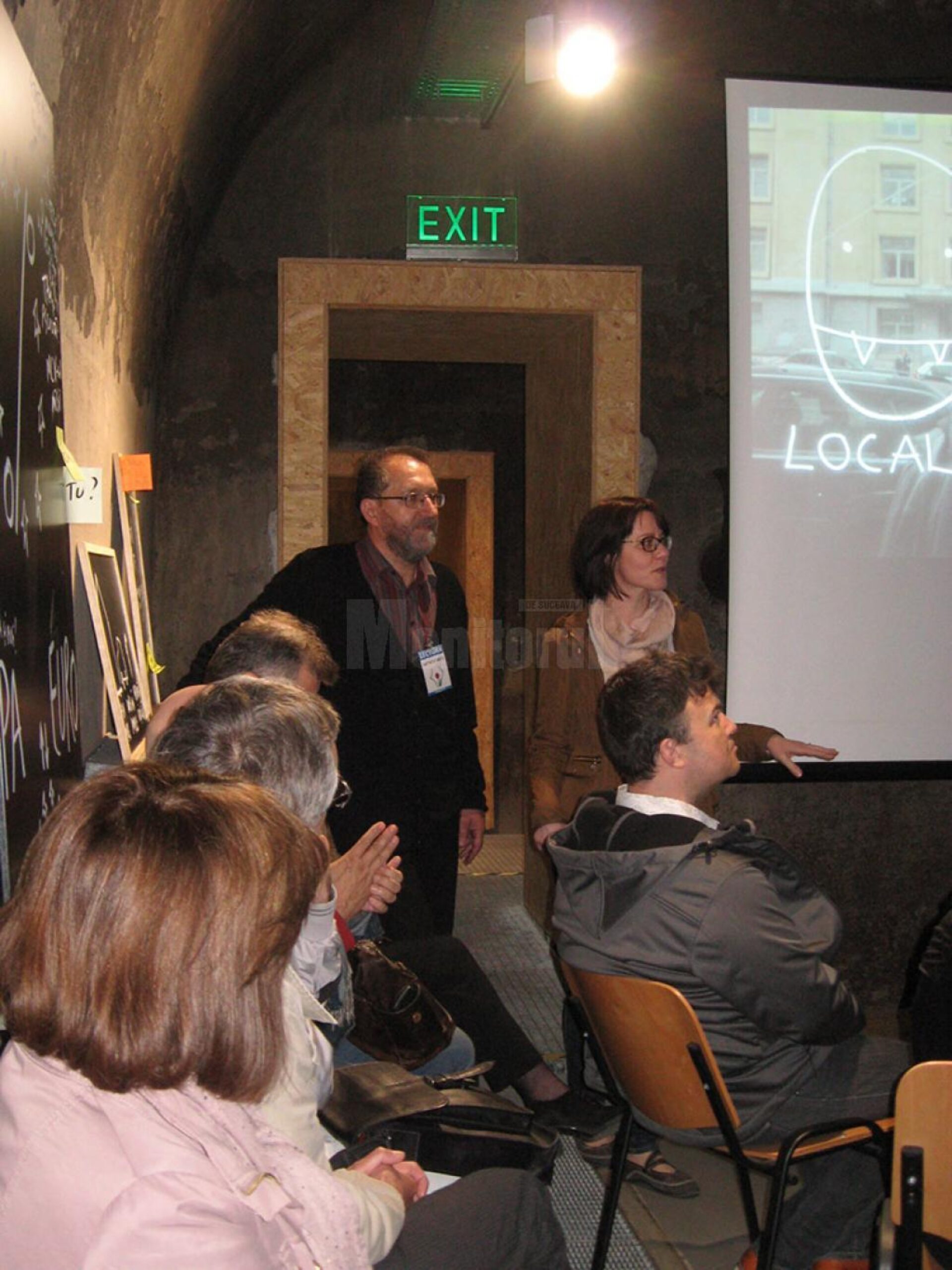 Prezentat, în calitate de gazdă, de arhitectul Constantin Gorcea, ca un artist „care poate să-și aleagă locul în care expune”, cu accentul că prin această opțiune „vrea să ne ajute să creștem”, Dan Perjovschi, pe care curatorul expoziției, Simona Nastac, l-a apreciat ca fiind „un performer prezent în torentul lumii contemporane”, înzestrat cu „o conștiință critică alertă, generozitate și umor”, s-a dezvăluit publicului printr-o expunere cu susținere PowerPoint.