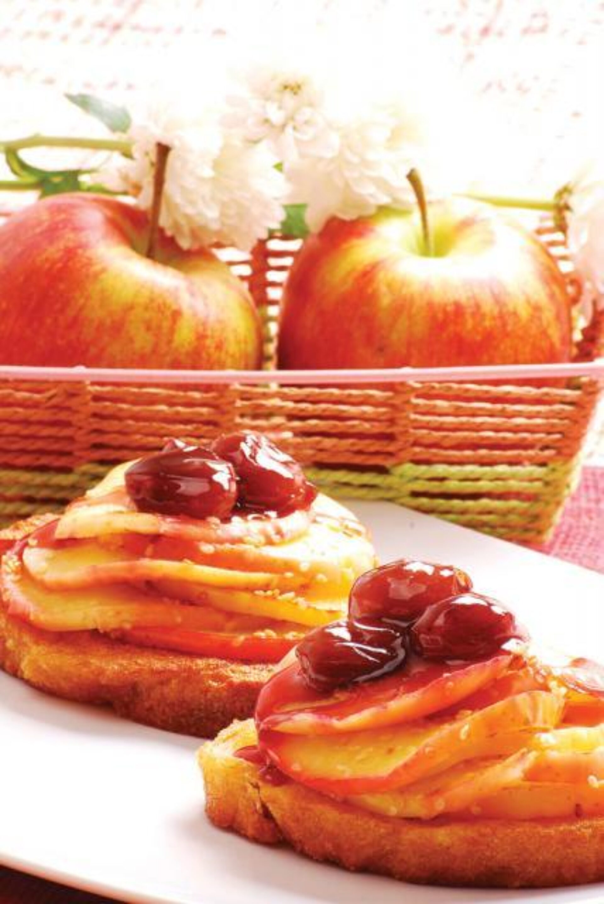 Puneți feliile prăjite pe farfurii calde. Deasupra așezați rondelele de măr prăjite, suprapuse, de la cea mai mare până la cea mai mică.