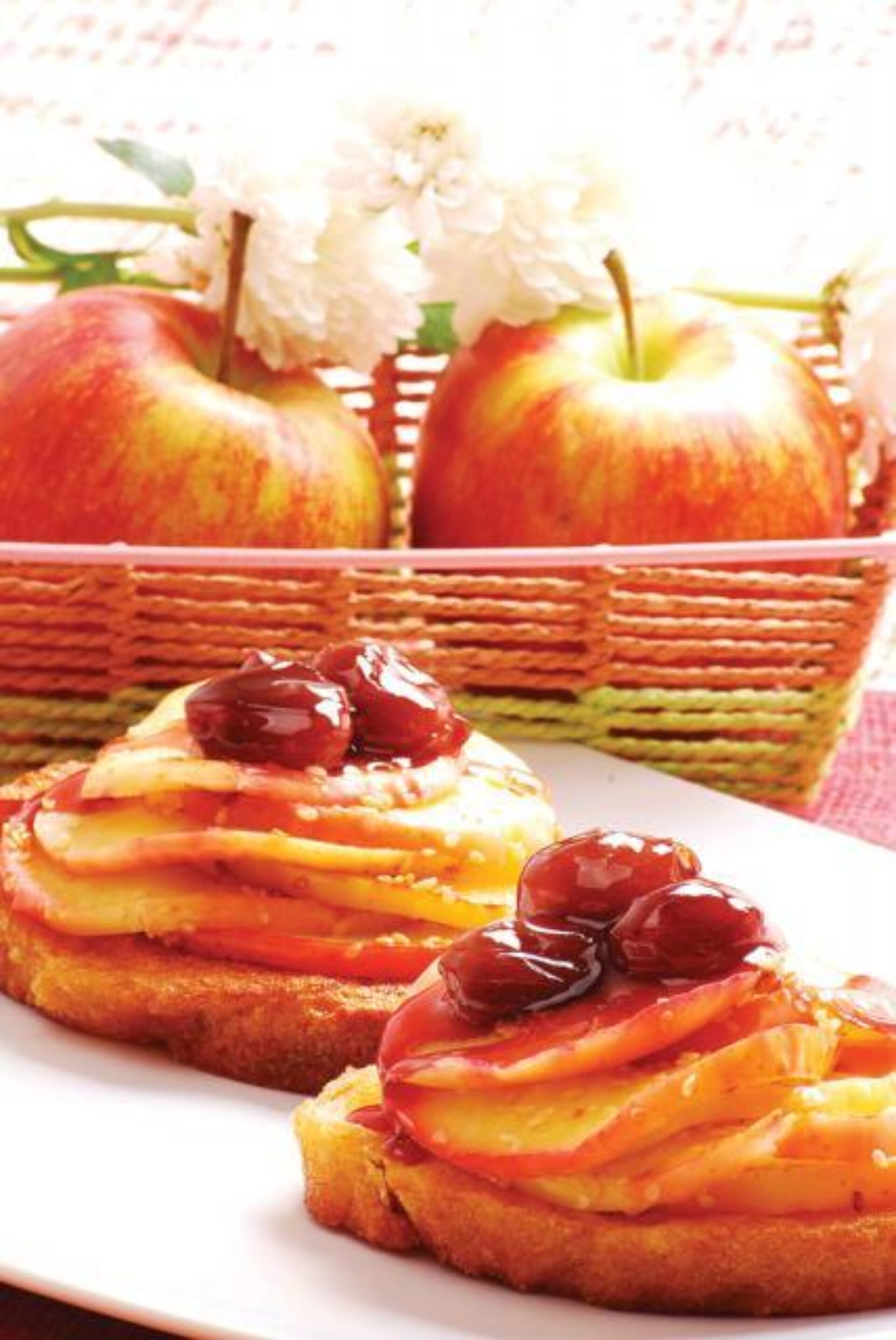 Scoateți cotoarele merelor, fără a le curăța de coajă. Tăiați-le apoi în rondele cu grosimea de 5mm. Stropiți rondelele cu zeamă de lămâie și apoi presărați-le cu susan. Presați susanul, ca să rămână lipit de mere. Prăjiți rondelele în unt. Lăsați-le apoi la răcit. Înmuiați puțin feliile de pâine în lapte. Bateți ouăle și treceți feliile înmuiate prin ou bătut și apoi prăjiți-le în unt, pe amândouă părțile. Puneți feliile prăjite pe farfurii calde. Deasupra așezați rondelele de măr prăjite, suprapuse, de la cea mai mare până la cea mai mică. Fierbeți un sirop din zahăr și 150ml apă și adăugați în el boabele de struguri. Lăsați-le să fiarbă câteva minute, până când siropul începe să se îngroașe și turnați-le peste rondelele de măr și peste feliile de pâine.