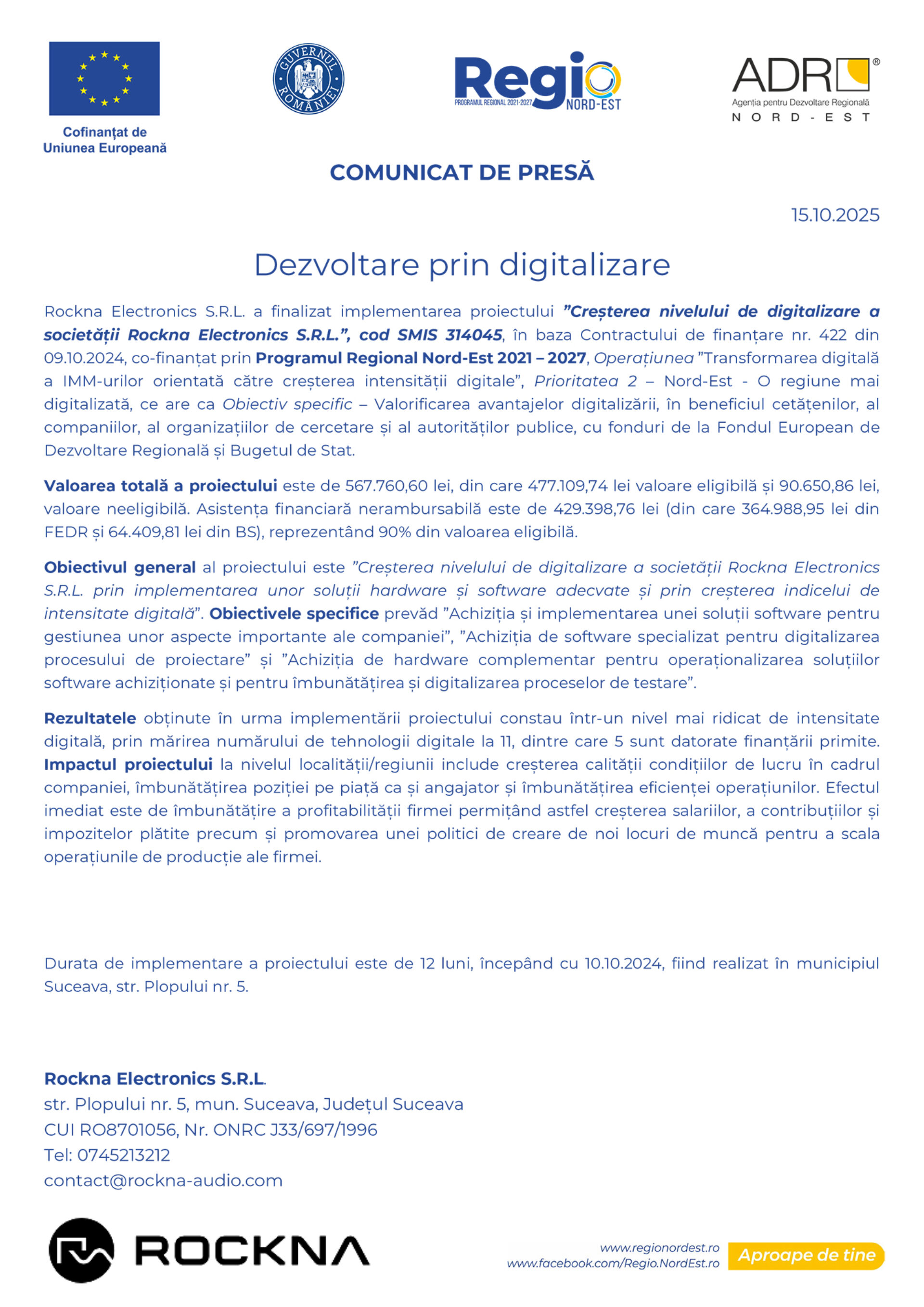 Rockna Electronics S.R.L. a finalizat implementarea proiectului ”Creșterea nivelului de digitalizare a societății Rockna Electronics S.R.L.”, cod SMIS 314045, în baza Contractului de finanțare nr. 422 din 09.10.2024, co-finanțat prin Programul Regional Nord-Est 2021 – 2027, Operațiunea ”Transformarea digitală a IMM-urilor orientată către creșterea intensității digitale”, Prioritatea 2 – Nord-Est – O regiune mai digitalizată, ce are ca Obiectiv specific – Valorificarea avantajelor digitalizării, în beneficiul cetățenilor, al companiilor, al organizațiilor de cercetare și al autorităților publice, cu fonduri de la Fondul European de Dezvoltare Regională și Bugetul de Stat.