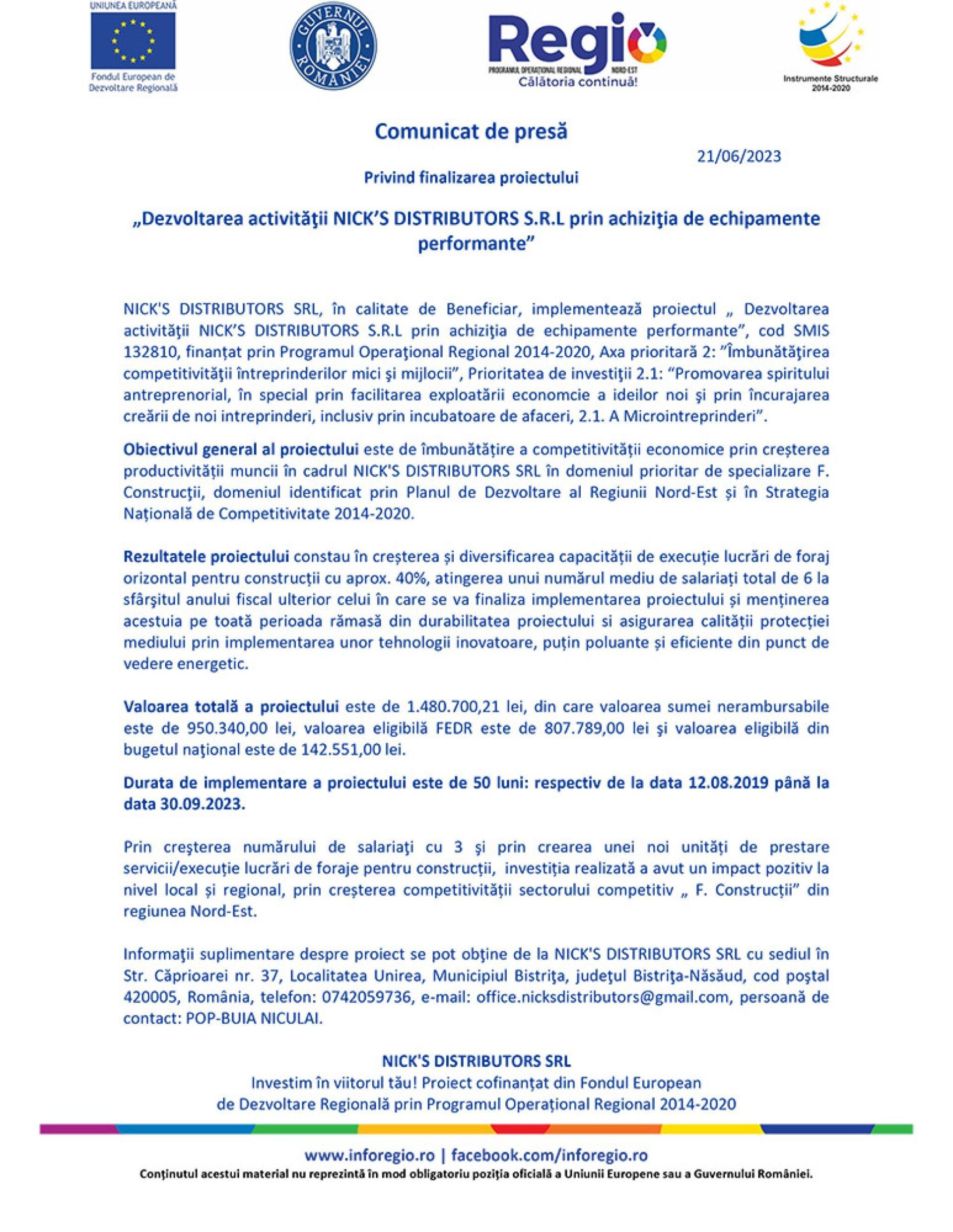 Informații suplimentare despre proiect se pot obține de la NICK’S DISTRIBUTORS SRL cu sediul în Str. Căprioarei nr. 37, Localitatea Unirea, Municipiul Bistrița, județul Bistrița-Năsăud, cod poștal 420005, România, telefon: 0742059736, e-mail: office.nicksdistributors@gmail.com, persoană de contact: POP-BUIA NICULAI.