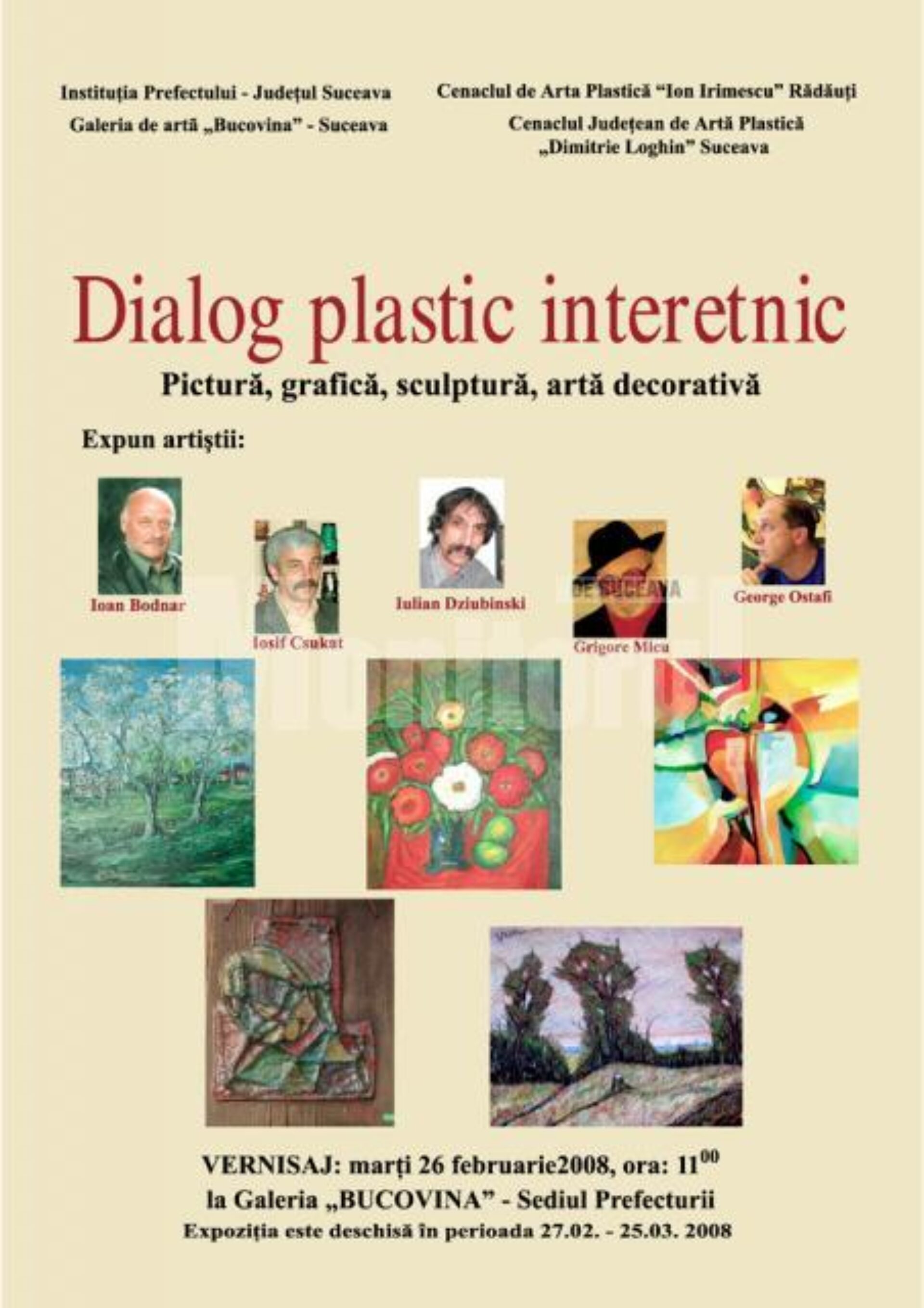 La Galeria „Bucovina” din incinta Palatului Administrativ s-a panotat ieri, succedând expoziției personale cu genericul “Zid” a pictorului rădăuțean Traian Postolache, expoziția intitulată “Dialog plastic interetnic”.