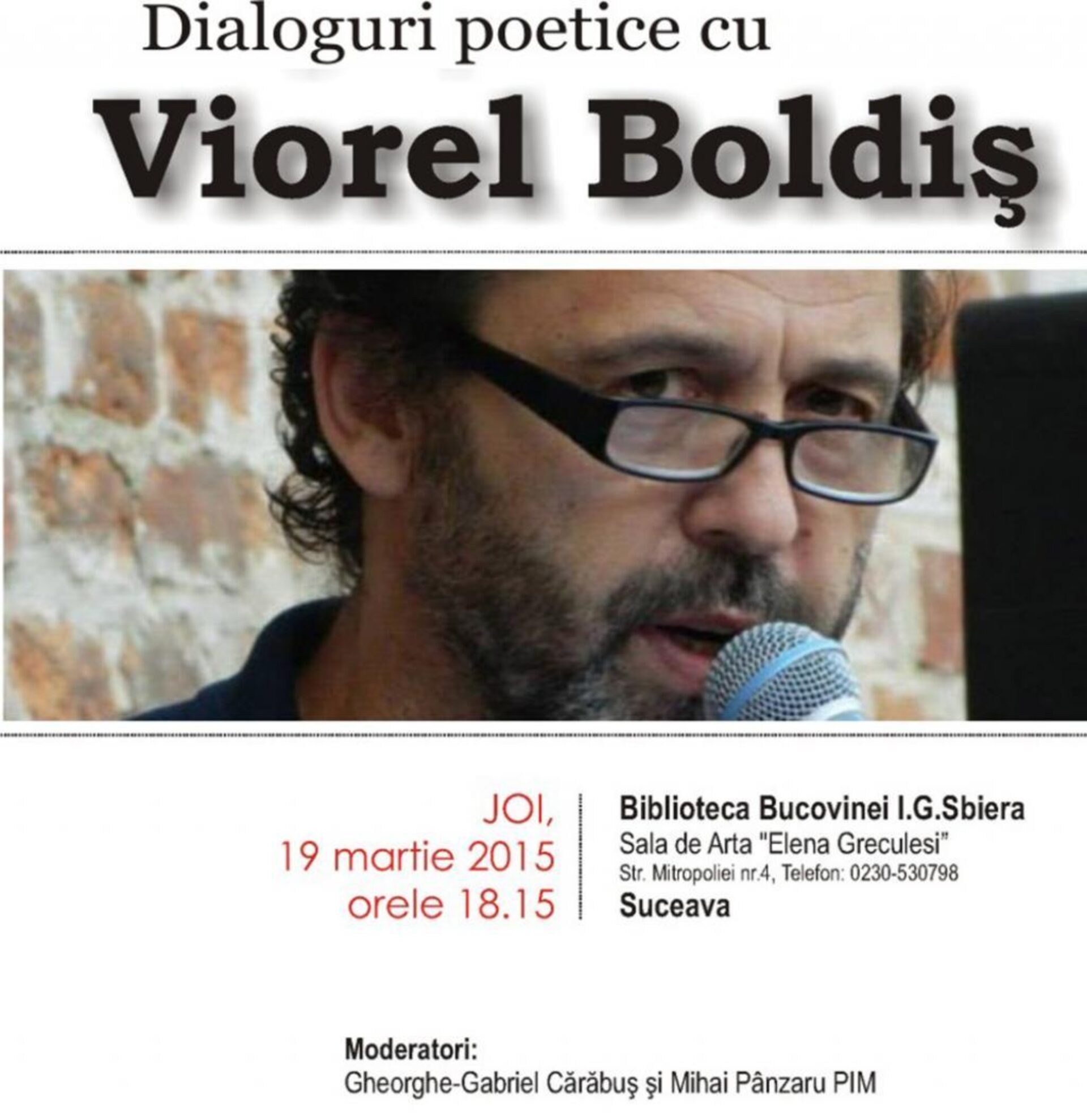 Sala de Artă „Elena Greculesi” a Bibliotecii Bucovinei „I.G. Sbiera” Suceava va găzdui joi, 19 martie, începând cu ora 18.15, în întâmpinarea Zilei Mondiale a Poeziei (21 martie), o manifestare în care, sub genericul „Dialoguri poetice”, publicul sucevean va avea prilejul să-l întâlnească pe poetul Viorel Boldiș, un orădean stabilit în Italia din anul 1995. Moderatorii manifestării sunt directorul bibliotecii publice sucevene, Gheorghe Gabriel Cărăbuș, și graficianul Mihai Pânzaru PIM.