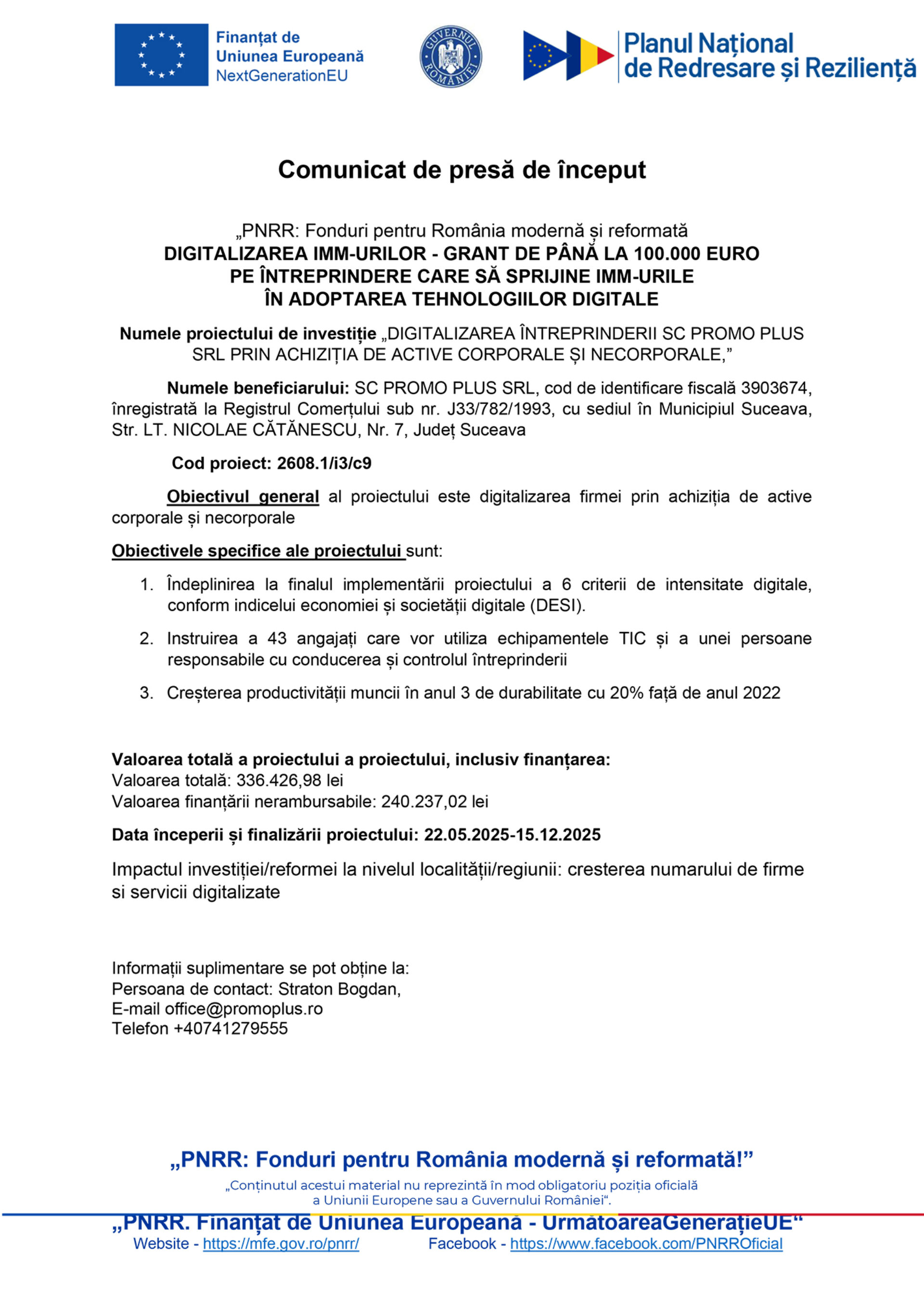 Numele proiectului de investiție „DIGITALIZAREA ÎNTREPRINDERII SC PROMO PLUS