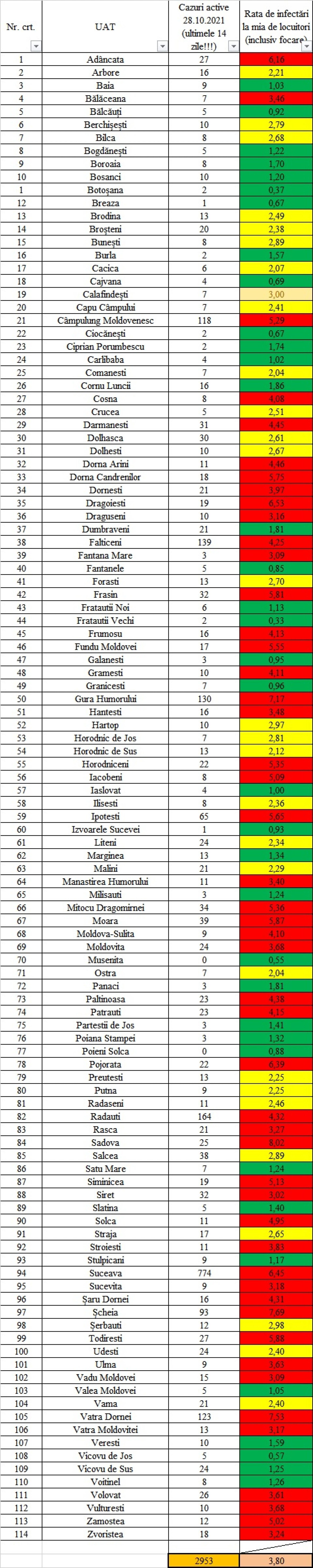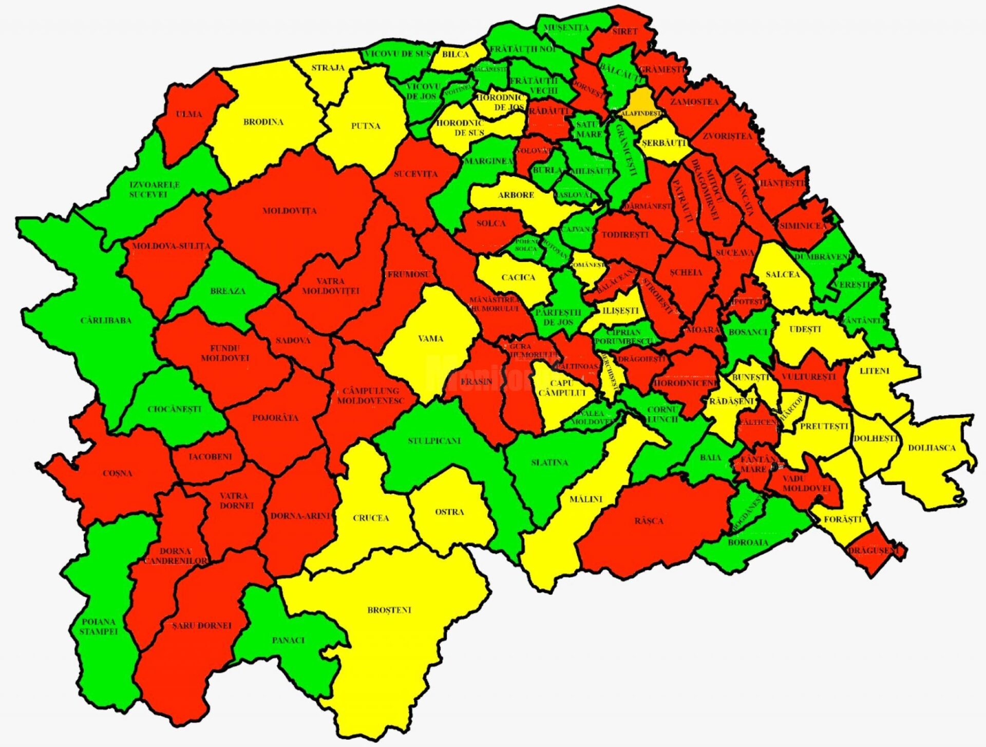 Conform distribuției cazurilor Covid-19 pe unități administrativ-teritoriale, din cele 114 localități, două nu au nici un caz de Covid în evoluție – Mușenița și Poieni Solca; două au câte un caz în evoluție, 14 au sub cinci cazuri în evoluție, 30 au sub zece cazuri în evoluție, iar 66 au peste zece cazuri în evoluție.