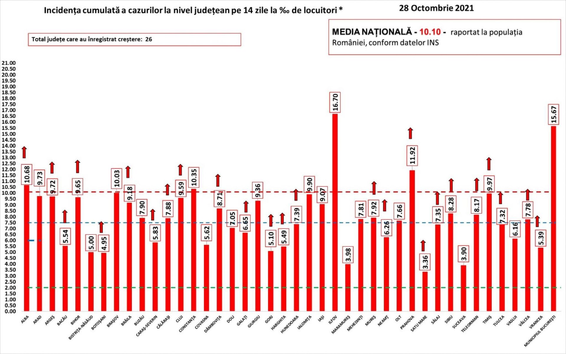 În carantină sunt 2.416 persoane, dintre care 193 intrate în intervalul 27-28 octombrie, și în izolare, în afara celor aflate în spital, se află 2.987 persoane, din care 165 intrate în intervalul 27-28 octombrie.