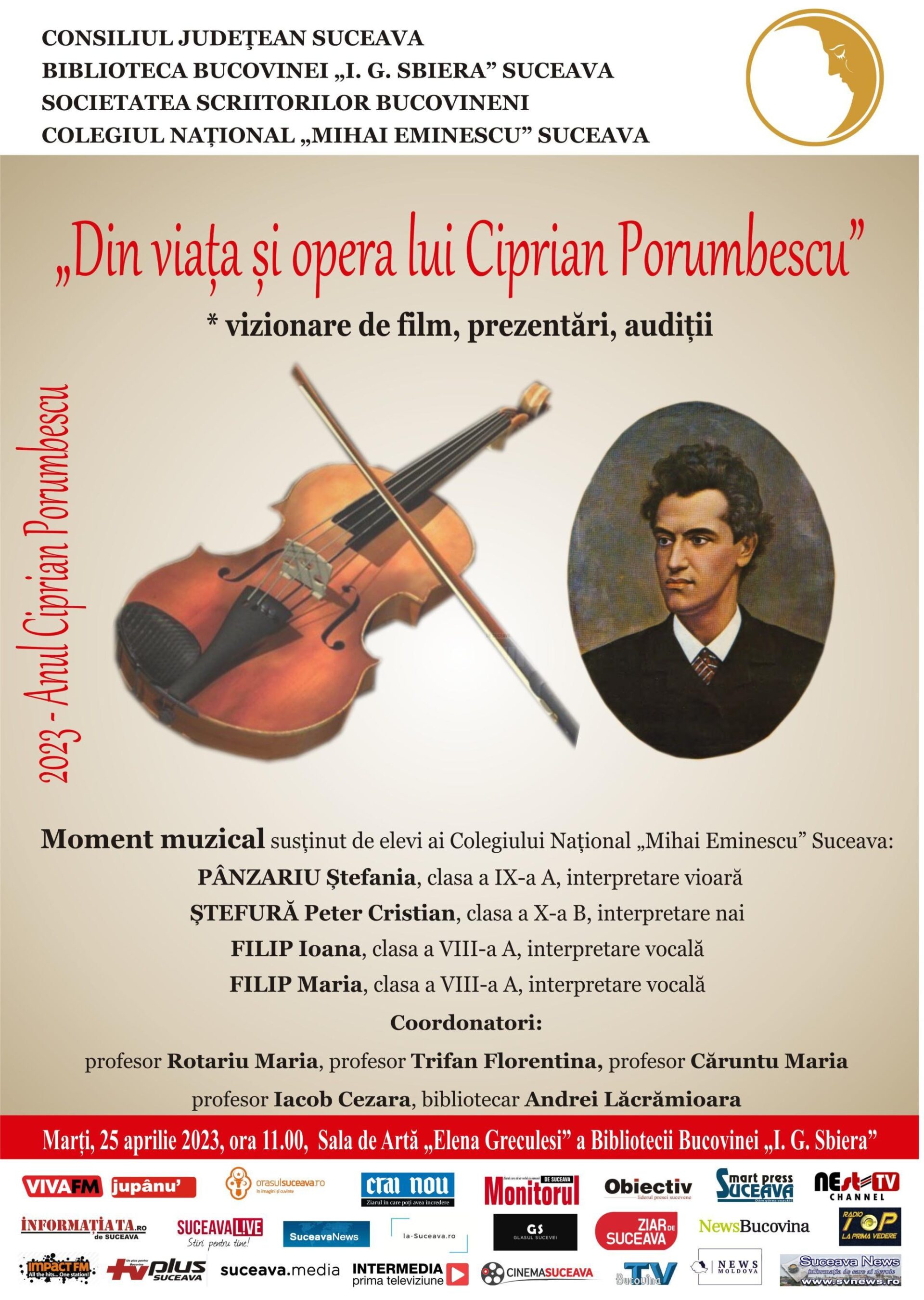 Biblioteca Bucovinei „I. G. Sbiera”, sub egida Consiliului Județean Suceava, în colaborare cu Societatea Scriitorilor Bucovineni și Colegiul Național „Mihai Eminescu” Suceava, organizează marți, 25 aprilie, începând cu ora 11.00, evenimentul „Din viața și opera lui Ciprian Porumbescu”: vizionare de film, prezentări, audiții, moment muzical.