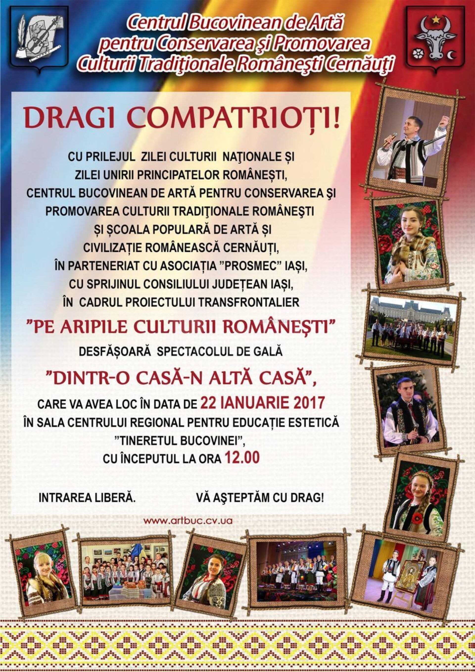 Centrul Bucovinean de Artă pentru Conservarea și Promovarea Culturii Tradiționale Românești Cernăuți organizează duminică, 22 ianuarie a.c., începând cu ora 12.00, în Sala Centrului Regional pentru Educație Estetică „Tineretul Bucovinei” din Cernăuți, un spectacol de gală dedicat Zilei Culturii Naționale și Zilei Unirii Principatelor Române.