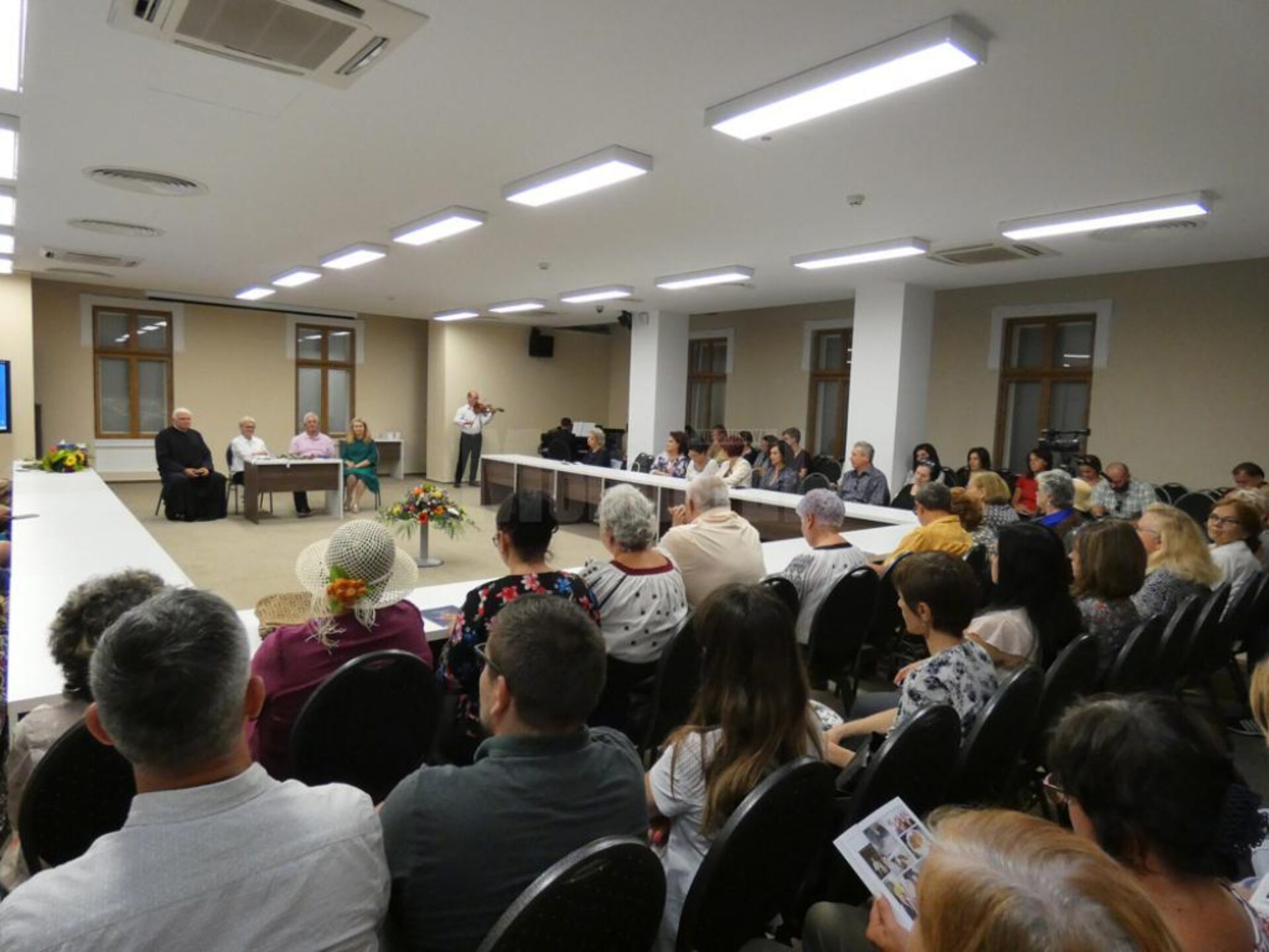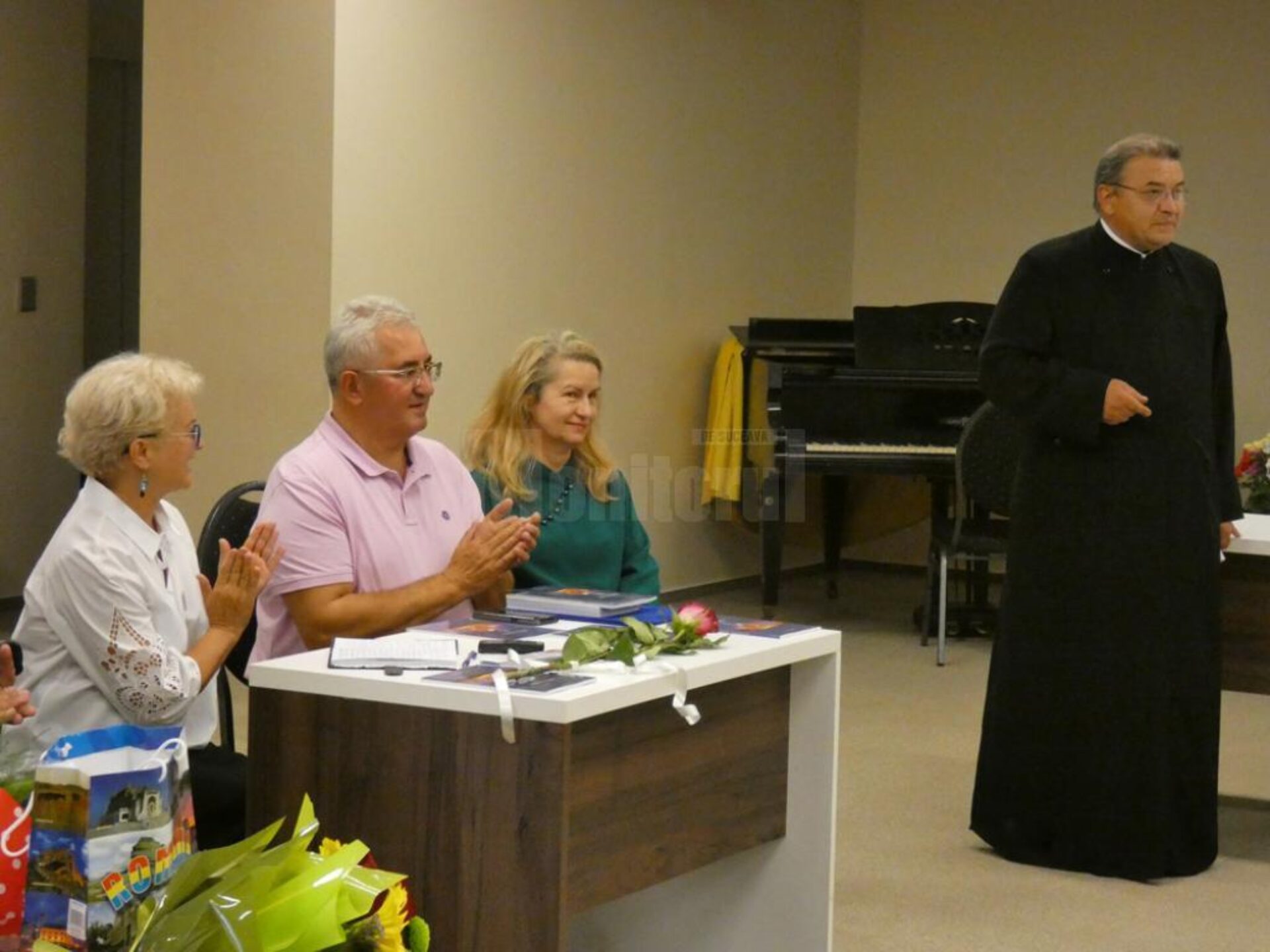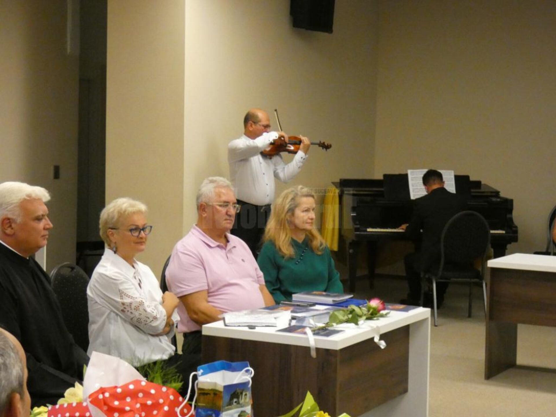 “Totdeauna am spus că cea mai mare știință din lume este teologia, pentru că mai întâi Dumnezeu a vorbit cu Omul și Omul cu Dumnezeu și după aceea au venit gândurile omului și interpretările sale. Lansarea cărții despre Țara Sfântă în Suceava nu e deloc întâmplătoare, este o carte manual, aveți totul, în amănunt, despre locurile pe care un om le vizitează în Țara Sfântă. Suceava este un oraș religios, cu oameni credincioși. De aceea Gabi, născută în Arad, a venit aici să își lanseze cartea, a spus că vrea să fie înfiată aici” a spus, ca introducere părintele Dinu Airinei, preot – însoțitor în numeroase pelerinaje, după momentul muzical de început – o emoționantă melodie interpretată la vioară și pian.