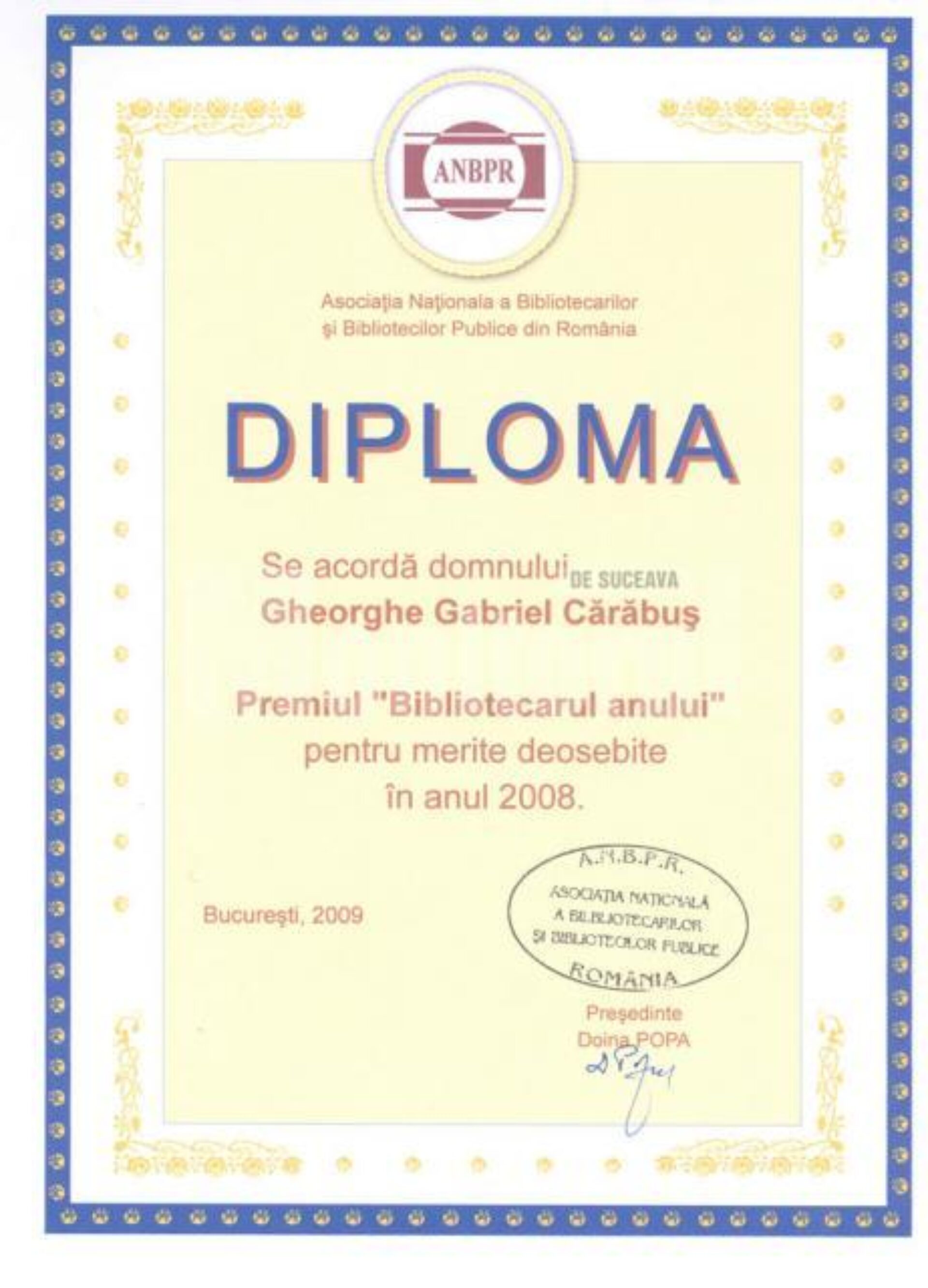 Asociația Națională a Bibliotecarilor și Bibliotecilor Publice din România i-a acordat prof. Gabriel Cărăbuș, directorul Bibliotecii Bucovinei „I.G. Sbiera” Suceava, Diploma „Bibliotecarul anului 2008”.