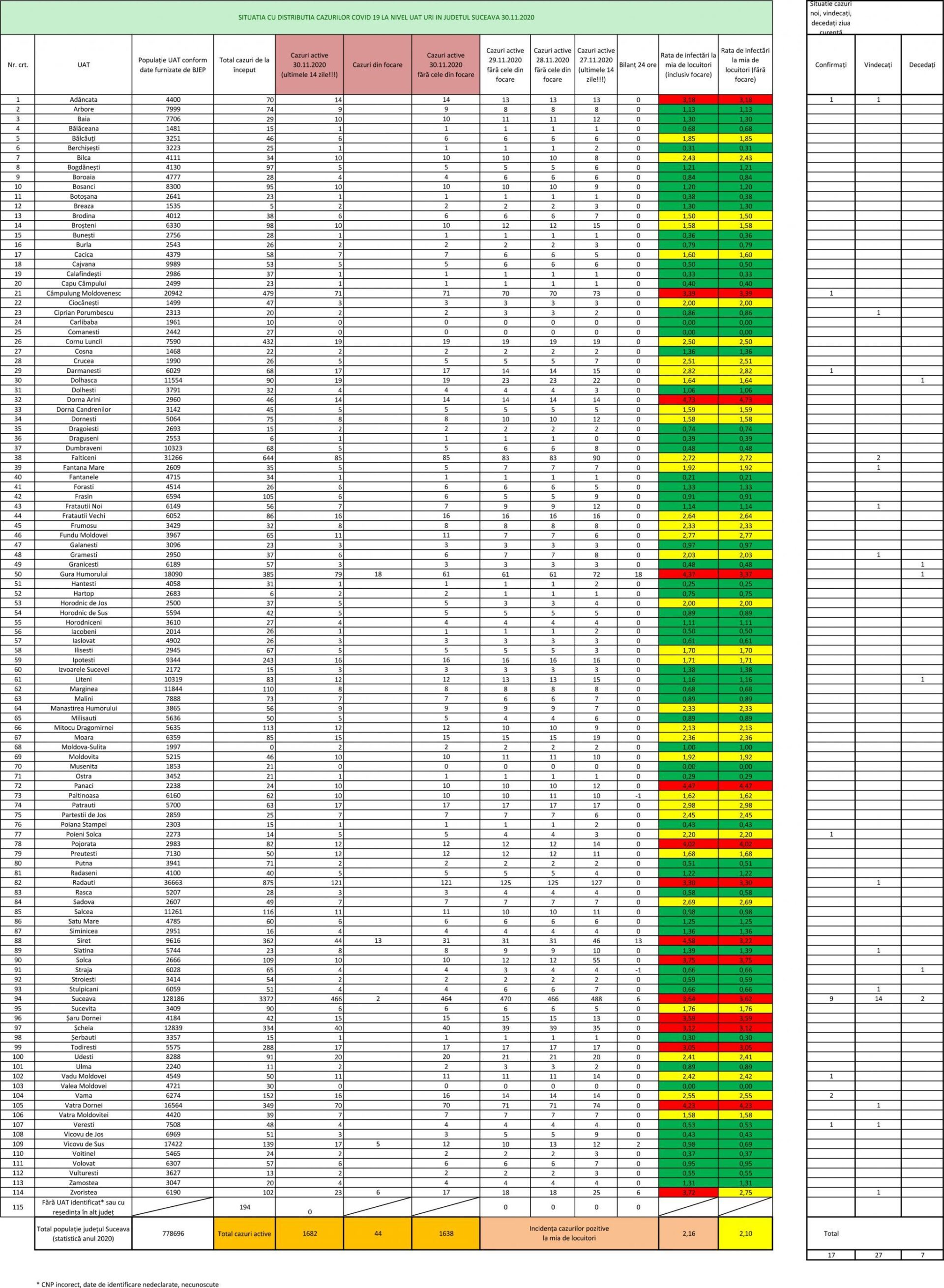 De asemenea, se constată că în data de 30 noiembrie șapte familii de suceveni au fost îndoliate de Covid-19: câte un deces s-a înregistrat la Dolhasca, Grănicești, Gura Humorului, Liteni și Straja și două decese în rândul persoanelor confirmate cu Covid-19 au fost în municipiul Suceava.
