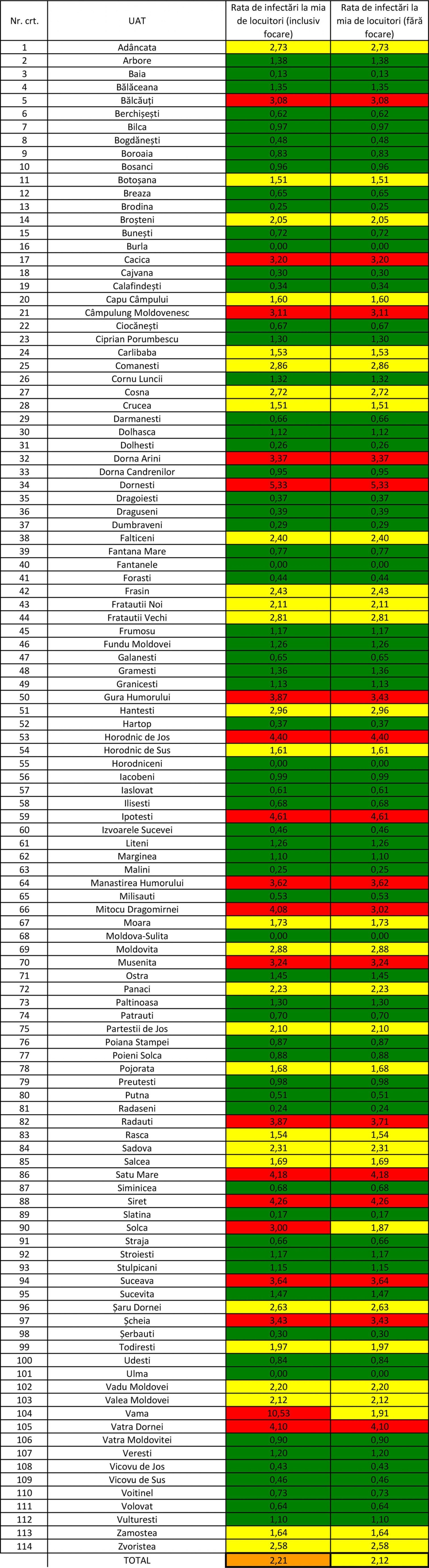 Doar cinci unități administrativ-teritoriale, din cele 114 din județul Suceava, mai sunt fără nici un caz de Covid-19 în evoluție, la această dată, a informat, marți, Prefectura Suceava. Acestea sunt Burla, Fântânele, Horodniceni, Moldova Sulița și Ulma. Conform distribuției cazurilor Covid-19, alte 13 unități administrativ-teritoriale au câte un caz în evoluție, 38 au sub cinci cazuri în evoluție, 21 au sub zece cazuri în evoluție, iar 37 au peste zece cazuri în evoluție.