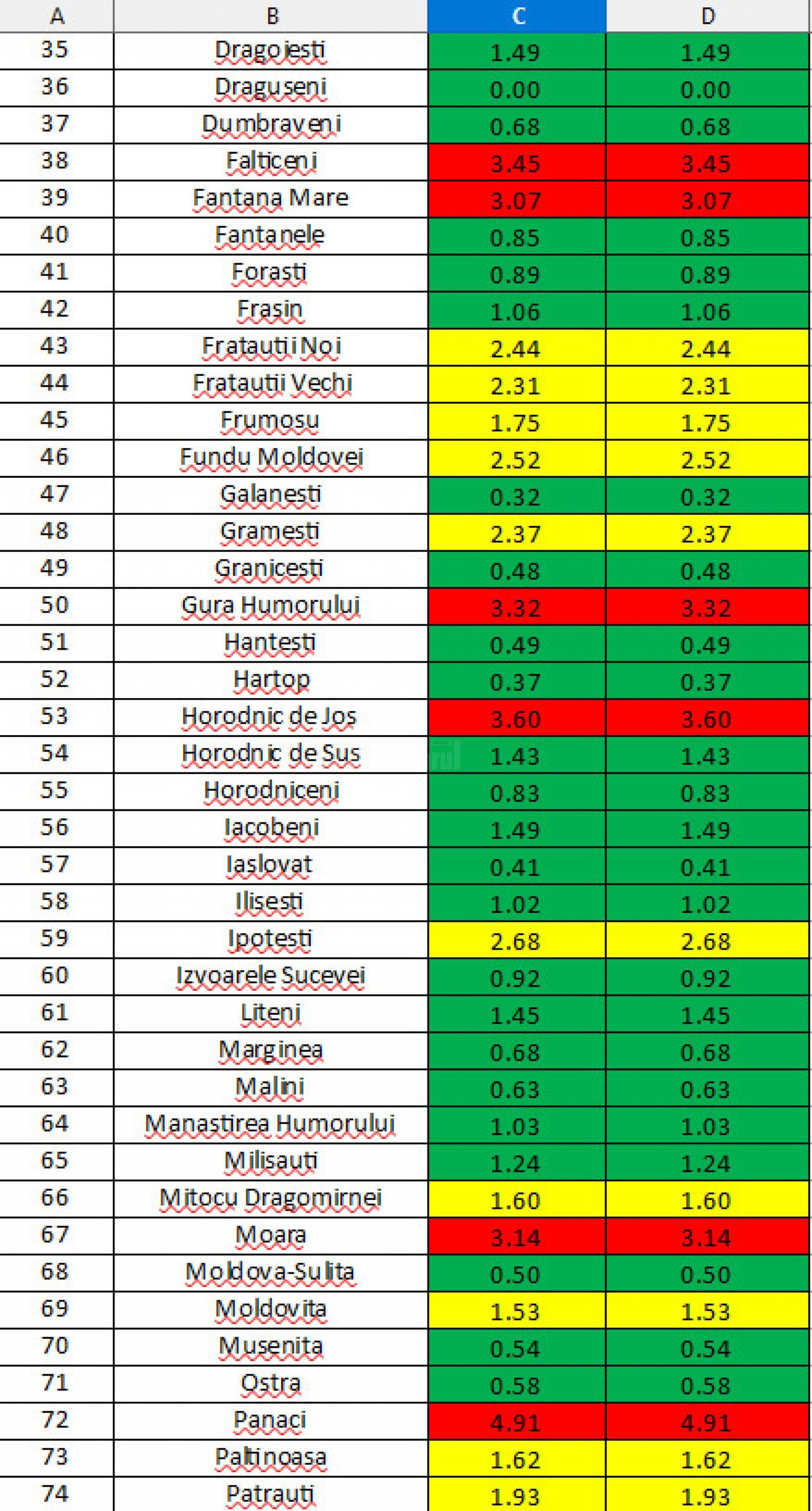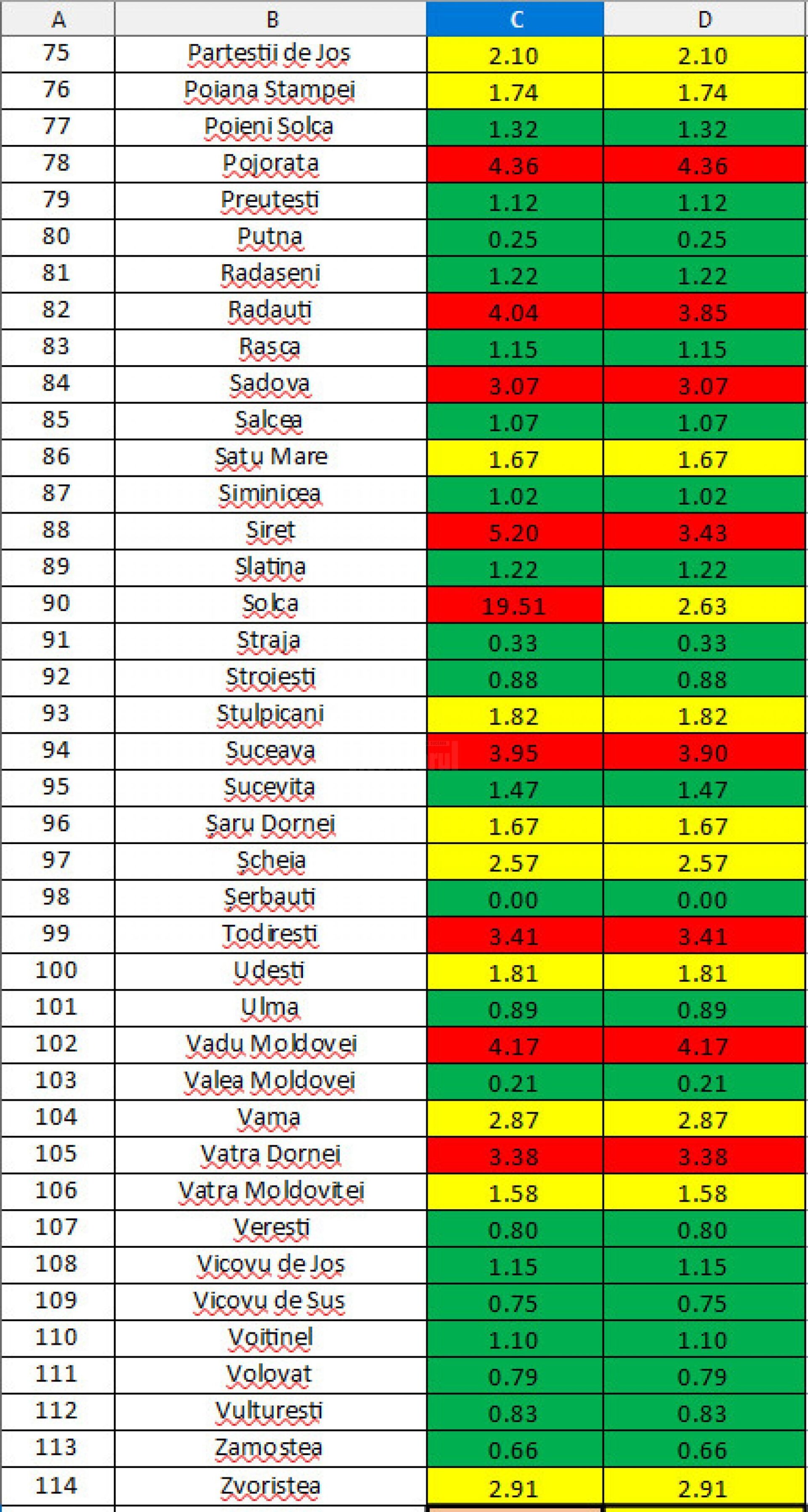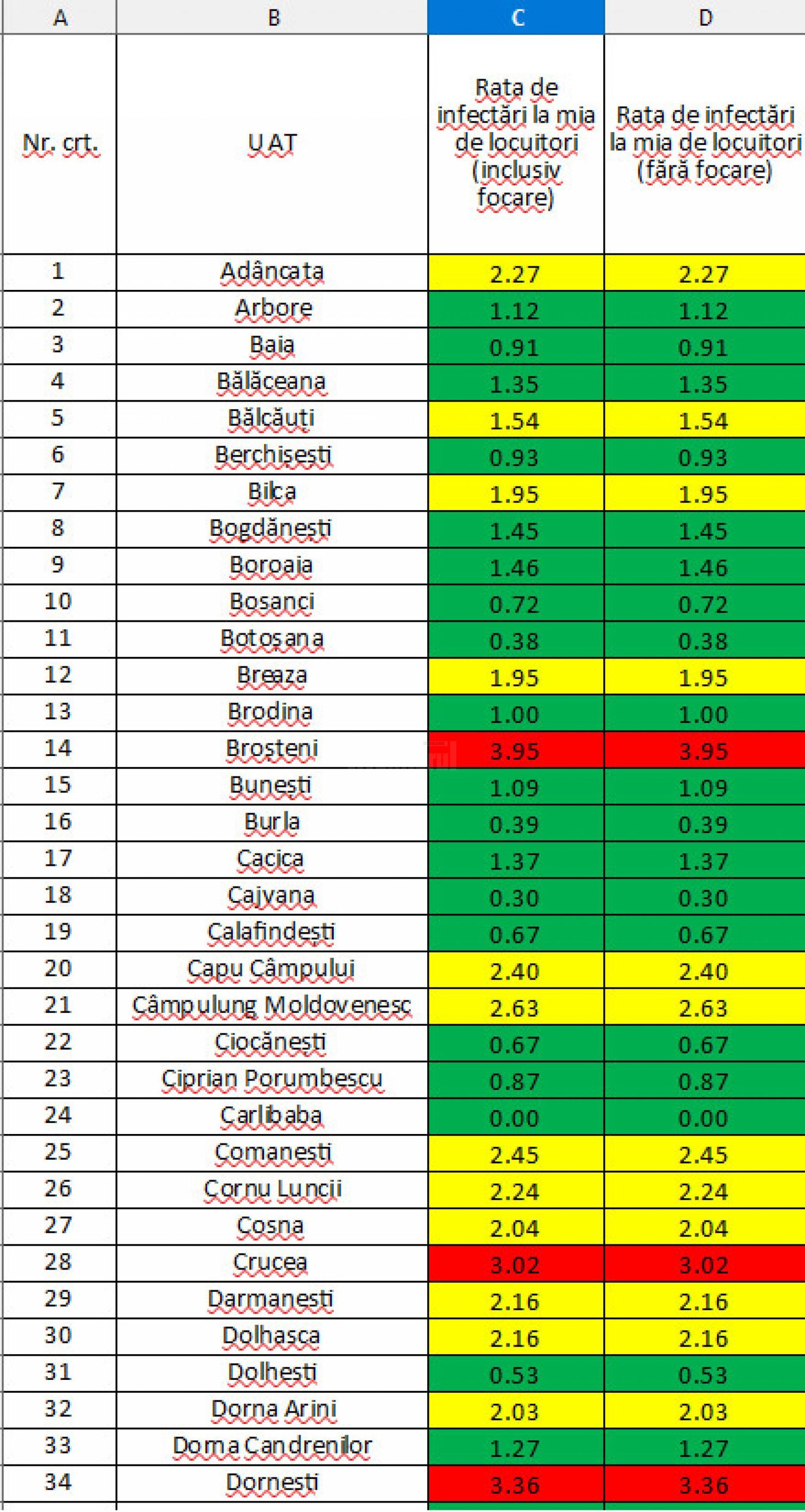 Județul Suceava are, la acest moment, doar trei comune în care nu se înregistrează nici un caz de Covid-19 în evoluție: Cârlibaba, Drăgușeni și Șerbăuți. Conform distribuției cazurilor Covid-19 pe unități administrativ teritoriale, din cele 114 unități administrativ teritoriale cele trei menționate nu au niciun caz de infecție Covid-19 în evoluție, 9 au câte un caz în evoluție, 31 au sub cinci cazuri în evoluție, 38 au sub zece cazuri în evoluție iar 33 au peste zece cazuri în evoluție.