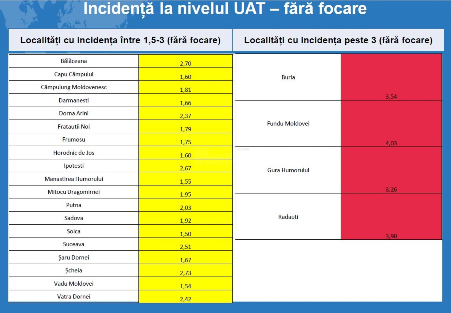 Doar patru din cele 114 de localități din județul Suceava mai sunt în scenariul roșu, cu o rată de infectare mai mare de 3 cazuri de coronavirus la mia de locuitori, fără a fi luate în considerare bolnavii din focare. În această situație se află municipiul Rădăuți, cu o rată de infectare de 3,90, orașul Gura Humorului – 3,26 și comunele Fundu Moldovei – 4,03 și Burla – 3,54. În cea ce privește municipiul Suceava, incidența cumulată la 14 zile a crescut astăzi de la 2,42 la 2,51 de cazuri de Covid la mia de locuitori.
