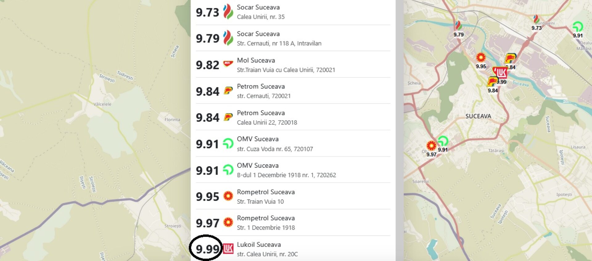 Duminică dimineața, la Lukoil motorina se vindea cu 9,99 lei/litru, în timp ce la cele două stații Rompetrol prețul era de 9,95 lei/litru, respectiv 9,97 lei/litru.