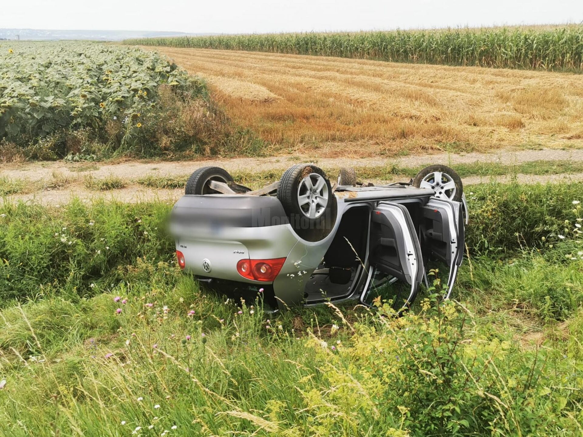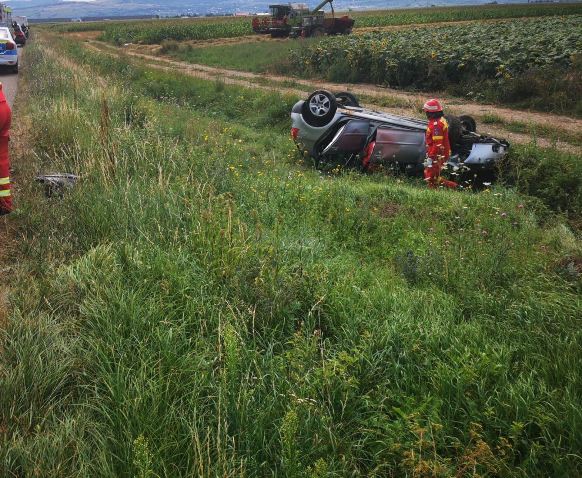 Pompierii militari suceveni au fost alertați, marți, în jurul orei 13.15, cu privire la faptul că un autoturism s-a răsturnat pe câmp, în afara părții carosabile, între comunele Dumbrăveni și Verești. La fața locului s-a constatat că în mașina răsturnată s-au aflat doi adulți și un copil. Personalul medical SMURD și cel de la Serviciul de Ambulanță au constatat că cei trei nu au leziuni vizibile, fiind doar în șocul de după accident, de altfel unul destul de violent.