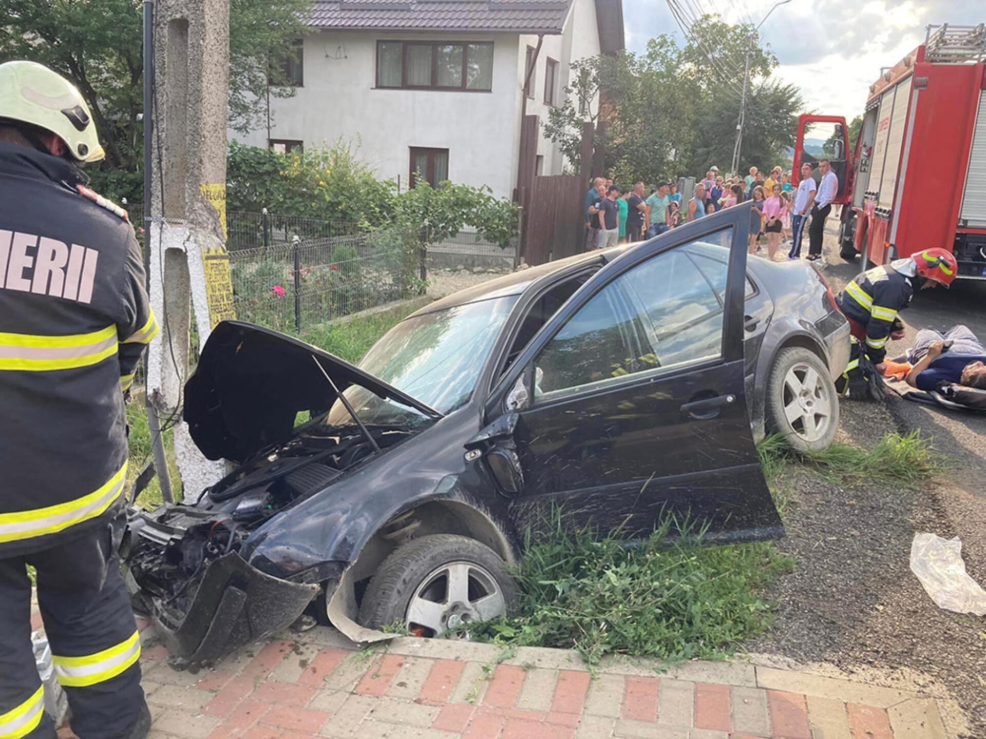 Impactul a fost violent, stâlpul fiind rupt, iar mașina avariată.