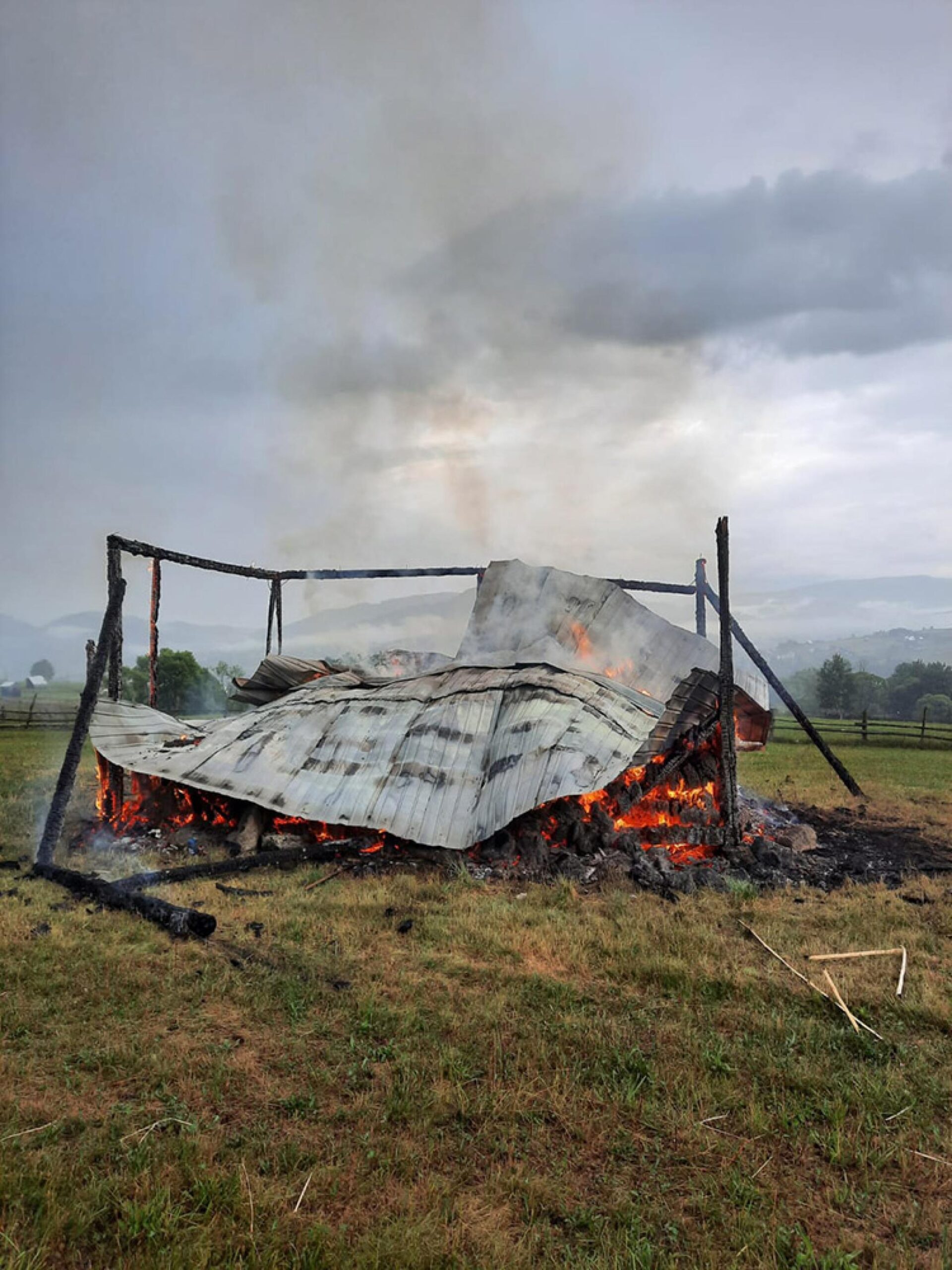Și în acest caz a fost vorba despre un depozit de furaje construit din lemn, lovit de trăsnet.