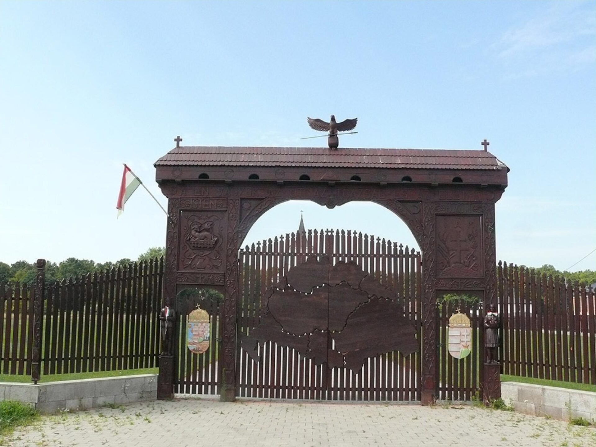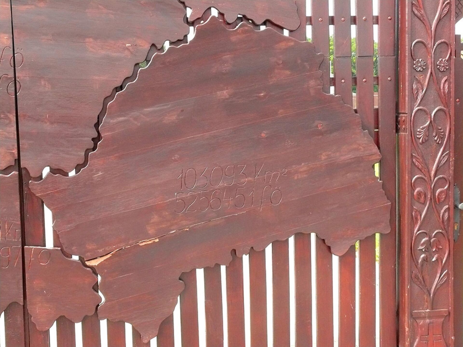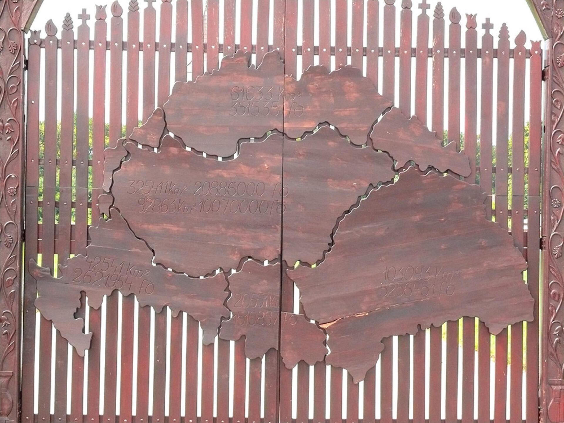 P:S. În imagini, poarta incintei unei biserici private din Budapesta, poartă expusă spațiului public. Pe ea figurează – decupate în lemn – teritoriile ”pierdute” și suprafețele acestora. Firește că oamenii din aceste teritorii nu par să conteze, ei nefiind reprezentați numeric.
