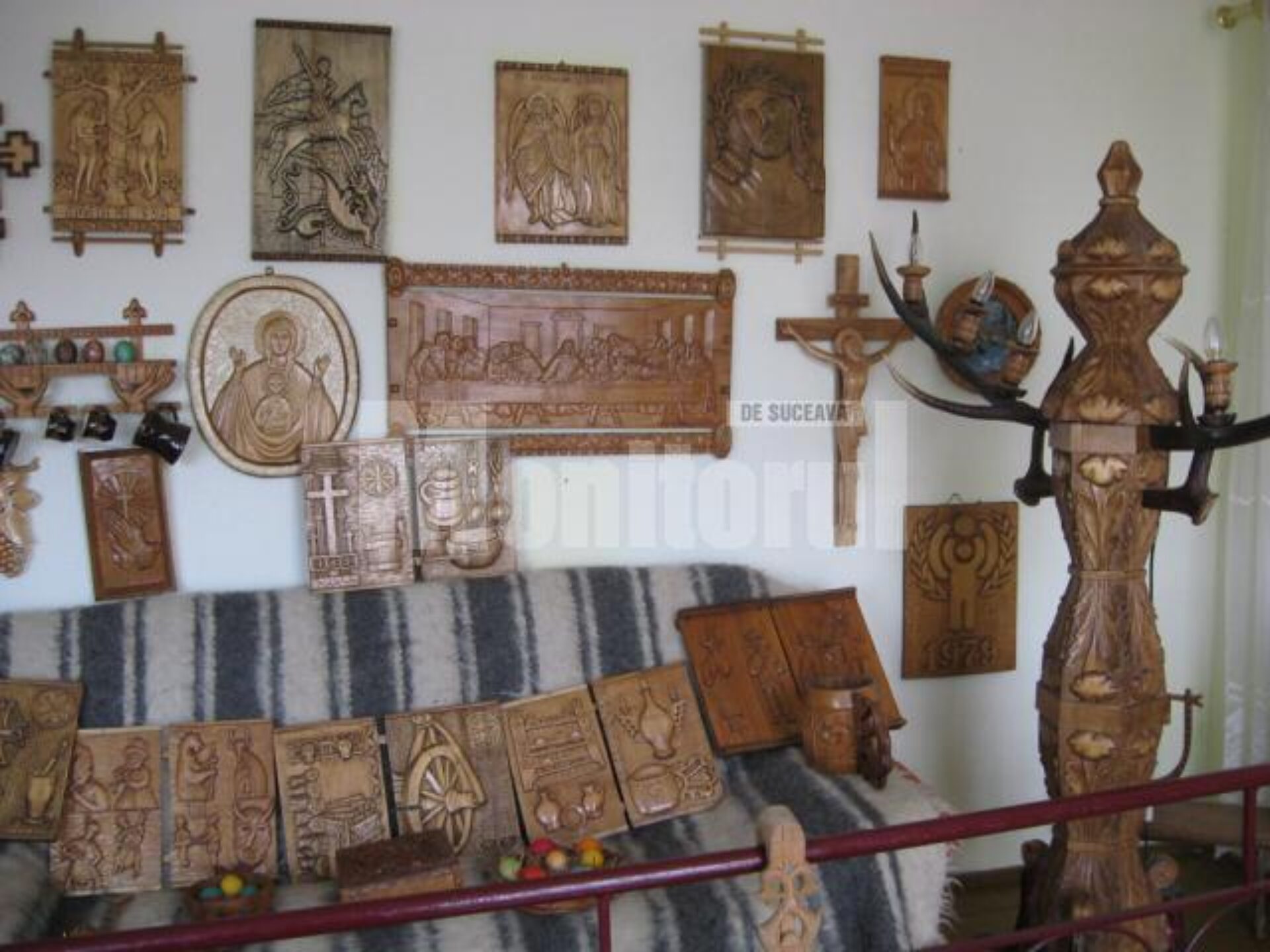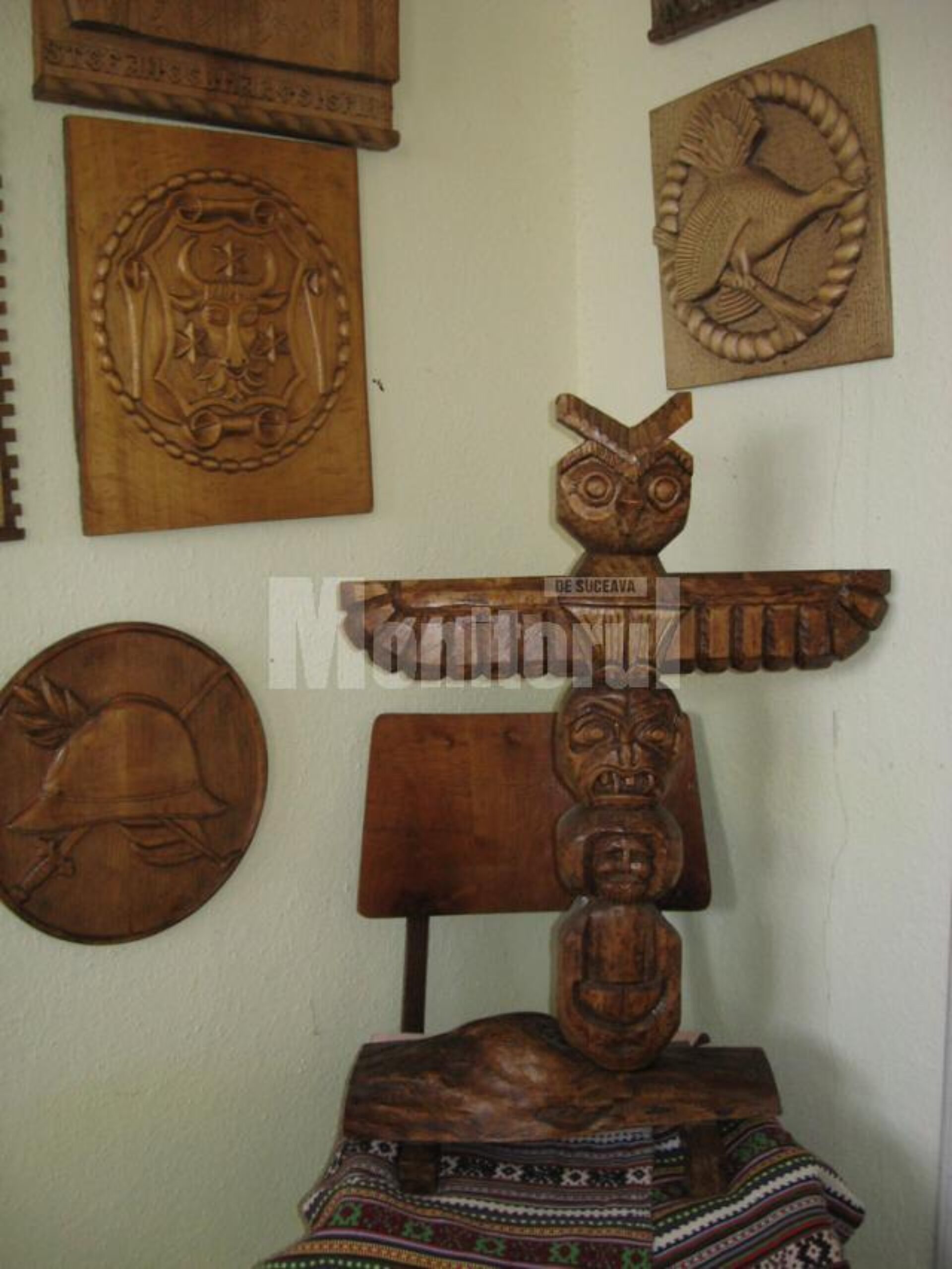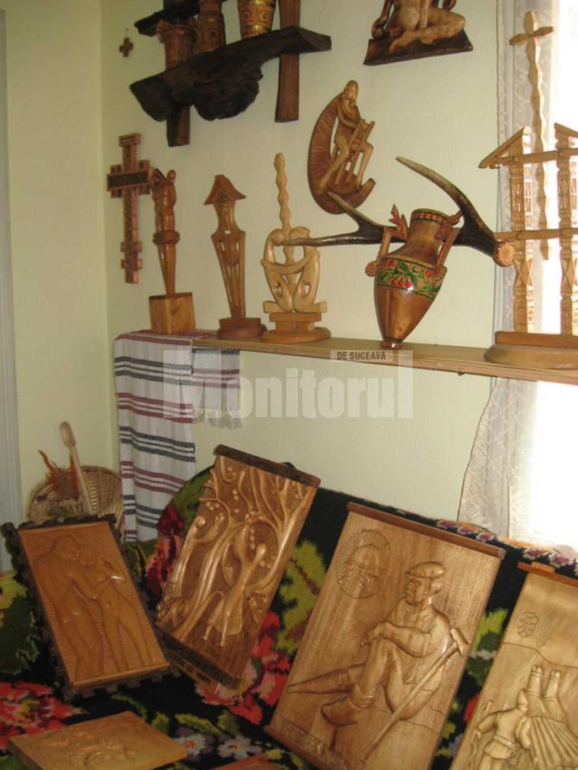 Icoane sculptate, basoreliefuri cu heruvimi și chipuri de țărani, plachete, troițe, totemuri și steme
