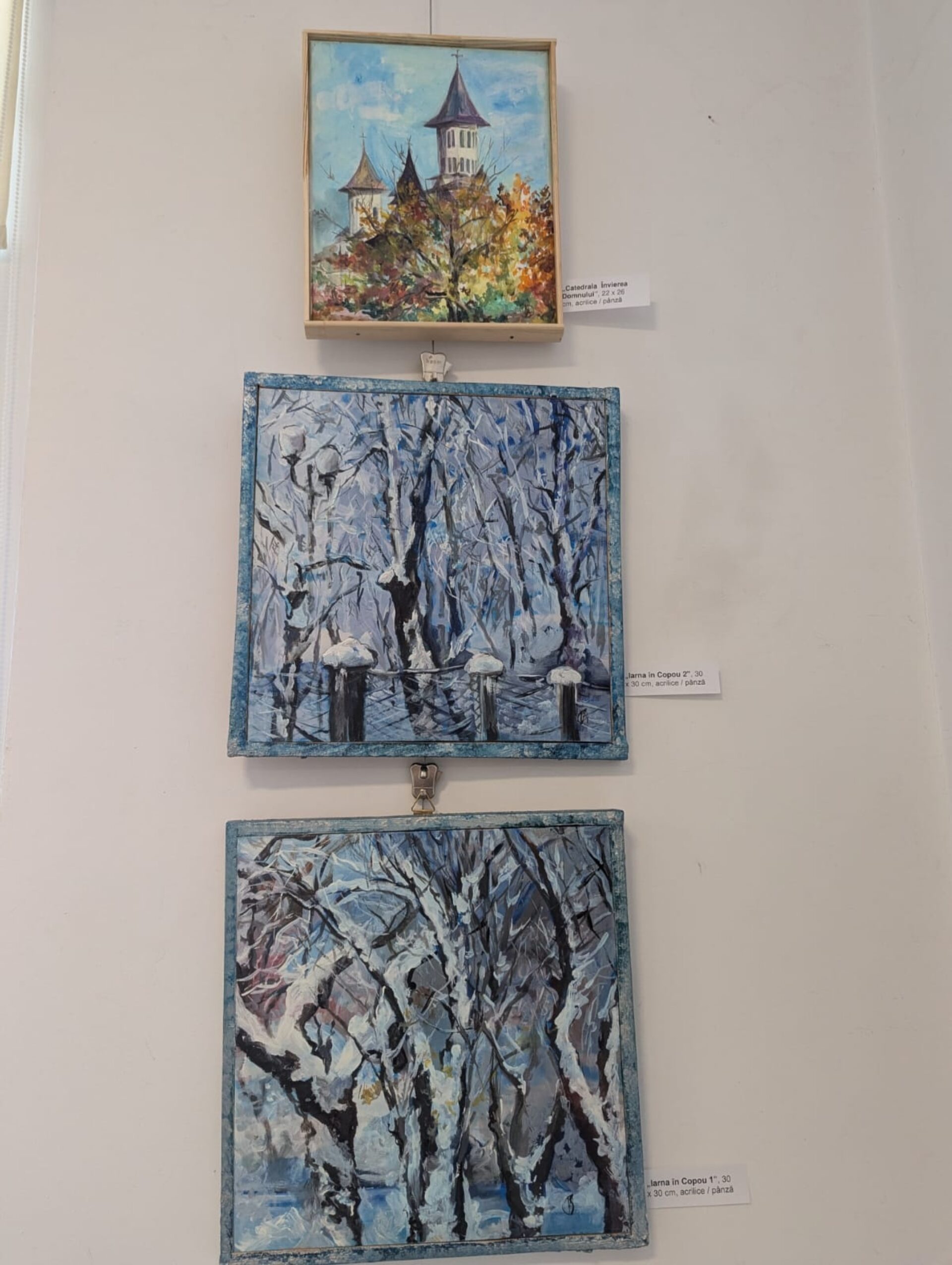 Puteți descoperi în expoziție lucrări precum „Pădurea de argint”, acrilic/carton, „Trandafirul solitar”, acrilic/pânză, „Peisaj pe Siret”, guașă/hârtie, „Cetatea”, acrilic/pânză, „Câmpul cu maci”, acuarelă/hârtie, „Garoafele”, acrilic/pânză, „Casa vecinului”, acrilic/pânză, „Meditație”, acrilic/pânză etc.