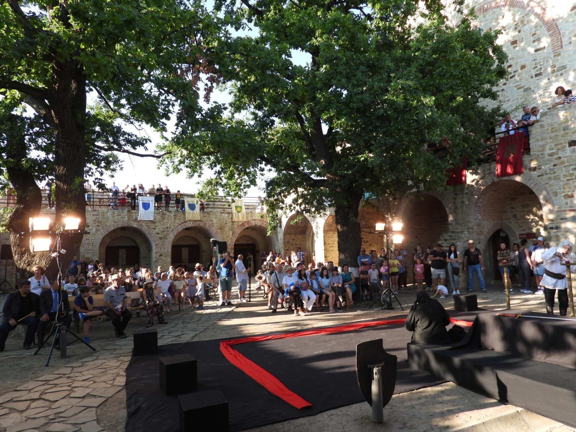 Prima zi a evenimentului “Povești medievale la Cetatea de Scaun a Sucevei” a continuat cu piesa de teatru “Apus de soare”, realizată de Teatrul Mihai Eminescu Botoșani, apoi de demonstrații de tir cu arcul și arbaleta, făcute de oștenii din Cetatea Bârsei, dar și o prezentare de arme, a grupului Terra Ultrasilvana.