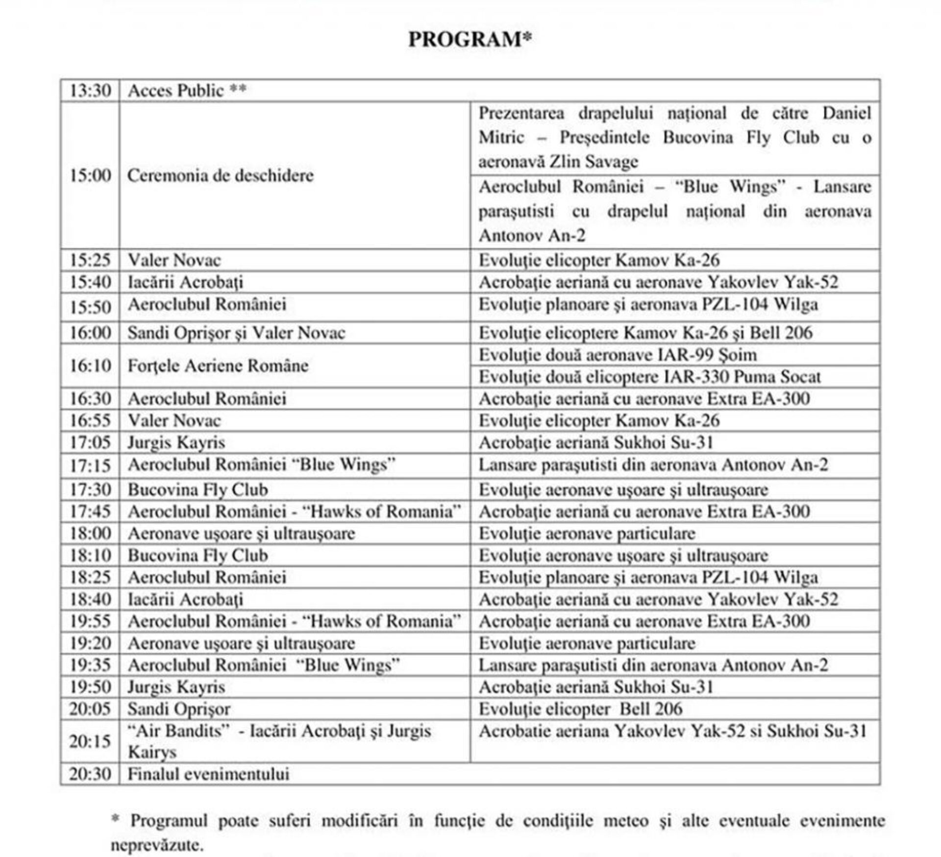 În premieră, la ediția de anul acesta a Suceava Air Show, spectatorii vor asista la demonstrații cu două avioane militare IAR 99 Șoim și două elicoptere de luptă IAR 330 Puma Socat. Spectacolul va fi deschis de prezentarea drapelului național de către președintele Bucovina Fly Club, Daniel Mitric, acesta urmând să piloteze o aeronavă Zlin Savage, după care spectatorii îi vor putea vedea pe parașutiștii Aeroclubului României, care vor coborî având la ei drapelul României. Și anul acesta, la mitingul aviatic de pe Aeroportul „Ștefan cel Mare” va participa multiplul campion Jurgis Kayris. Ultima evoluție a spectacolului aviatic va începe la ora 20:15, cu o acrobație aeriană susținută de Jurgis Kayris și Iacării Acrobați, completată de un spectacol pirotehnic.