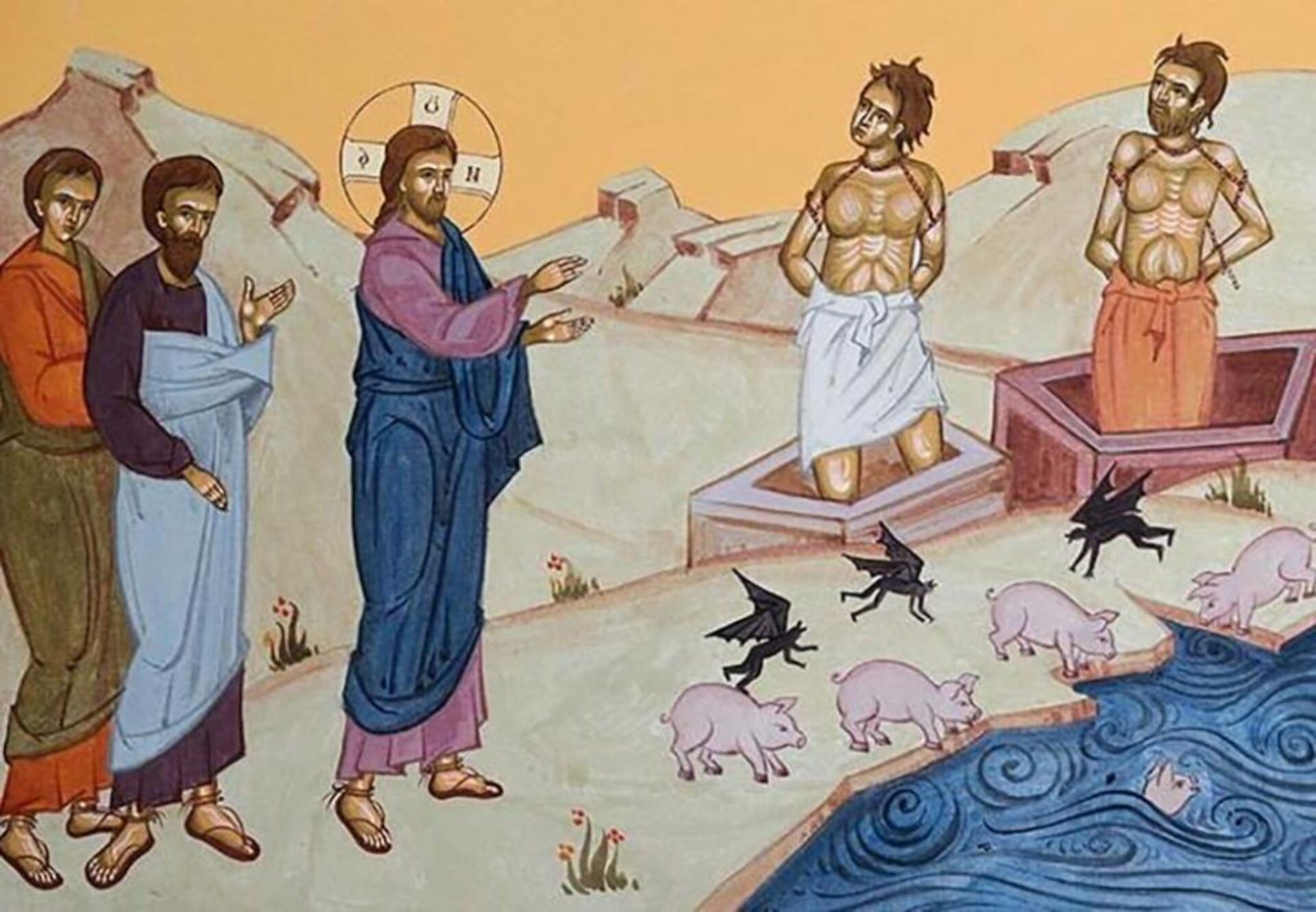 „În vremea aceea, trecând Iisus dincolo, în ținutul Gadarenilor, L-au întâmpinat doi demonizați care ieșeau din morminte, atât de cumpliți, încât nimeni nu putea să treacă pe calea aceea. Și, iată, au început să strige și să zică: Ce ai cu noi, Iisuse, Fiul lui Dumnezeu? Ai venit aici mai înainte de vreme ca să ne chinuiești? Departe de ei era o turmă mare de porci, păscând. Iar demonii Îl rugau, zicând: Dacă ne scoți afară, lasă-ne să intrăm în turma de porci. Atunci El le-a zis: Duceți-vă! Iar ei, ieșind, s-au dus în turma de porci. Și îndată toată turma s-a aruncat de pe țărm în mare și a pierit în apă. Iar păzitorii au fugit și, ducându-se în cetate, au spus toate cele întâmplate cu demonizații. Și, iată, toată cetatea a ieșit în întâmpinarea lui Iisus și, văzându-L, L-au rugat să plece din hotarele lor. Iar Iisus, intrând în corabie, a trecut marea și a venit în cetatea Sa.” (Matei 8, 28-34; 9, 1)