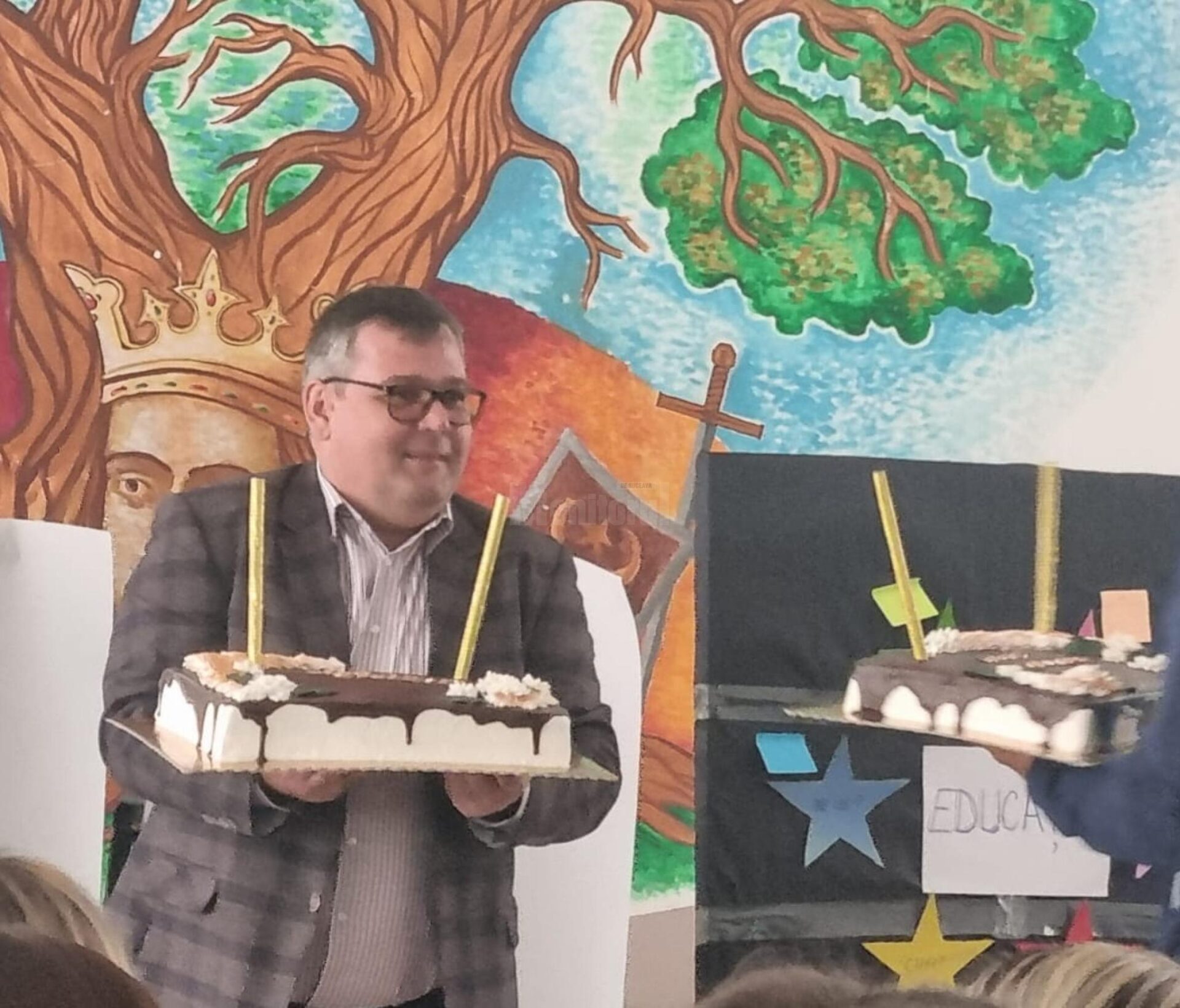 Reprezentantul Sindicatului, profesor Gheorghe Aurelian Onoi, împreună cu reprezentanții unității, au „îndulcit” activitatea cu un tort ornat semnificativ Zilei Educației…