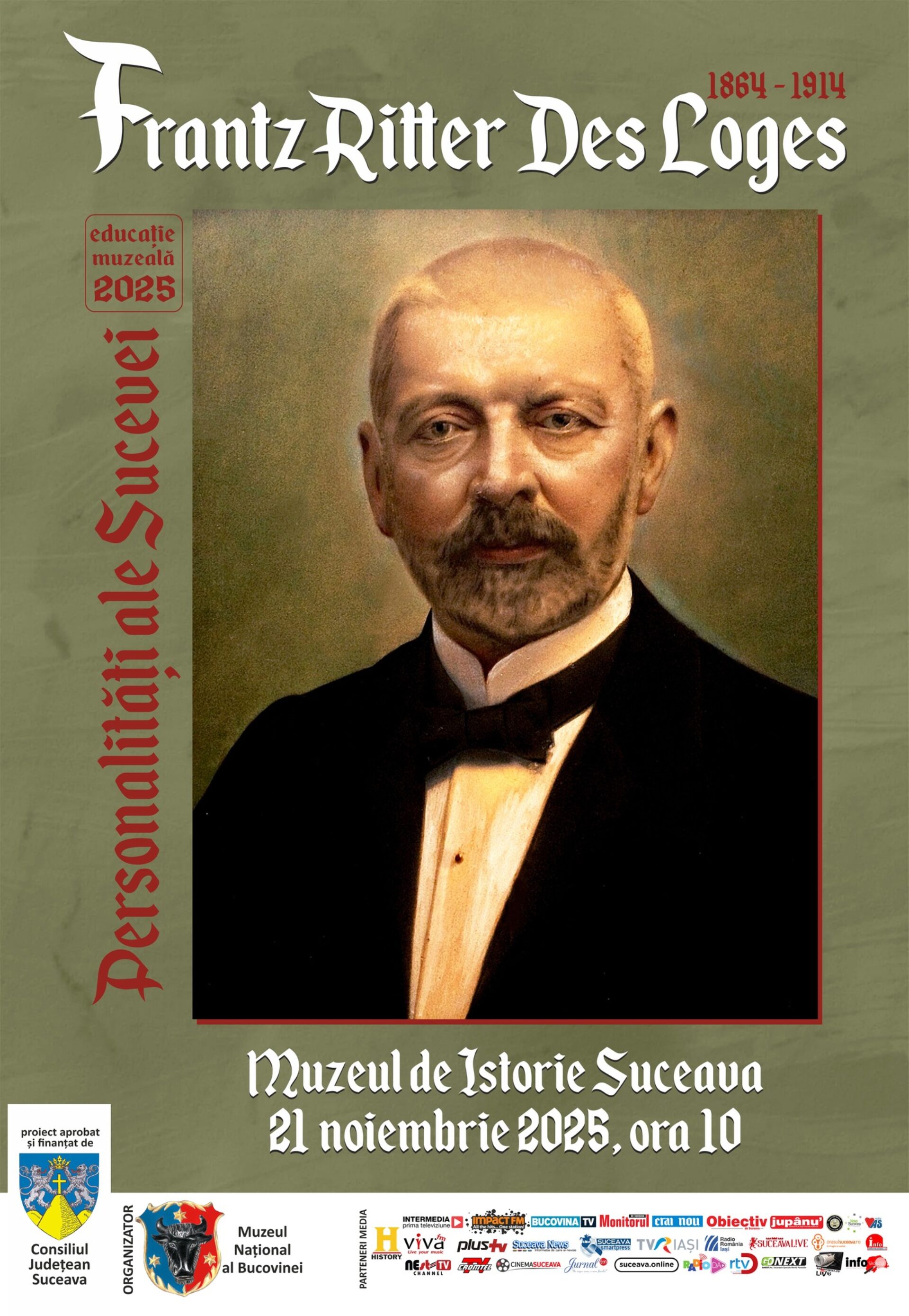Muzeul Național al Bucovinei organizează vineri, 21 noiembrie 2025, la ora 10:00, ora de muzeu: „Personalități ale Sucevei: Frantz Cavaler des Loges – un primar care a schimbat Suceava”. Muzeul de Istorie îi întâmpinăm vineri pe elevii clasei a XI-a F de la Colegiul Național „Mihai Eminescu” Suceava, împreună cu prof. Rodica Cozaciuc, la o lecție muzeală dedicată unei personalități impresionante: Frantz Ritter des Loges (1864-1914), cel mai longeviv primar al orașului. Timp de 23 de ani, el a transformat Suceava în orașul modern pe care îl cunoaștem astăzi: Palatul Administrativ, Colegiul Național „Ștefan cel Mare”, Spitalul Vechi, electrificarea orașului, aducțiunea de apă și canalizarea… și multe alte proiecte care au rămas până azi repere importante.