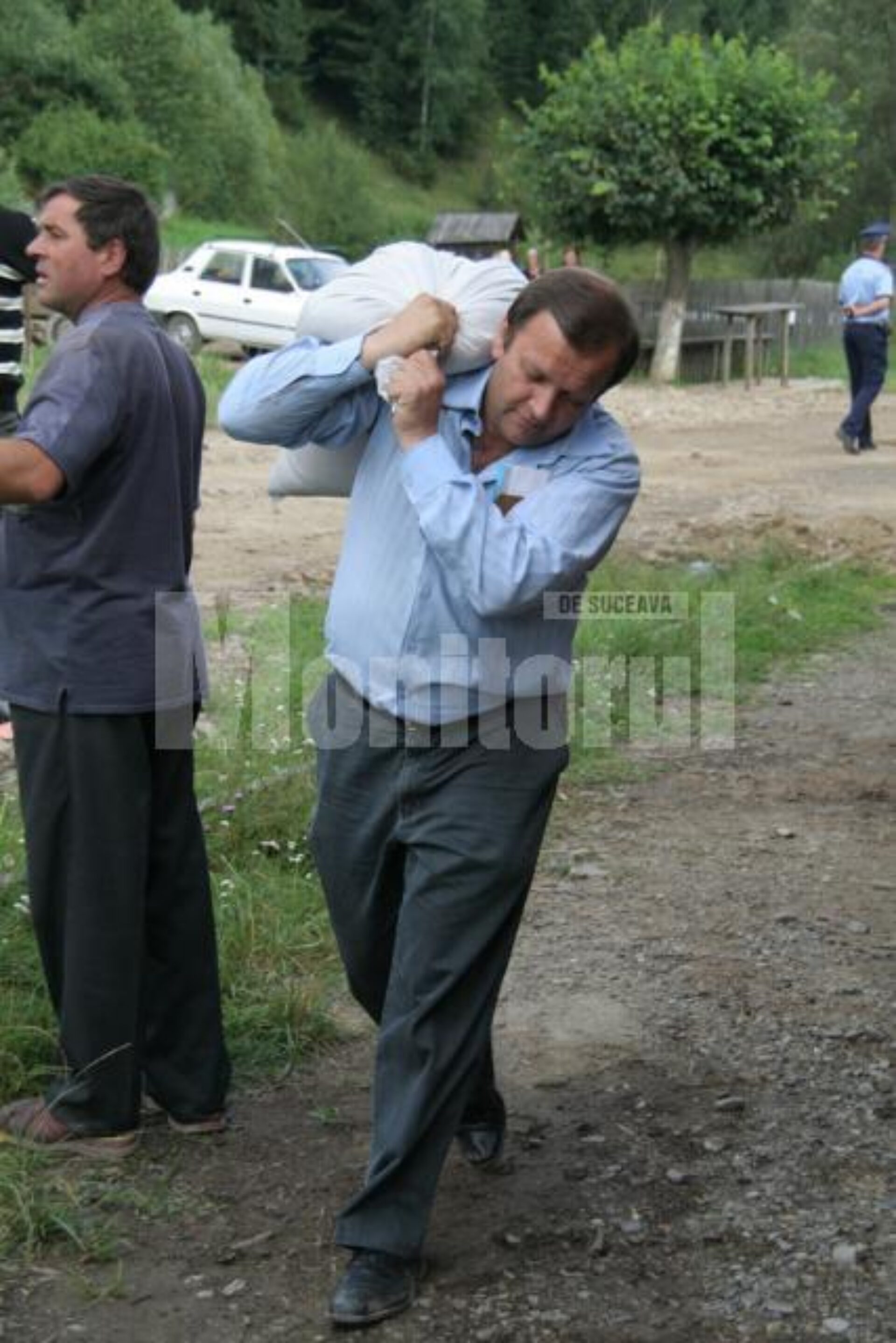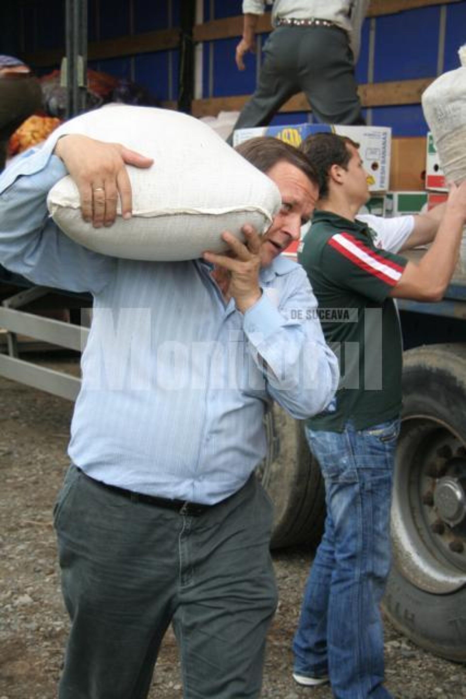 Președintele PD-L Suceava, Gheorghe Flutur, a mobilizat rapid câțiva localnici și autoritățile din zonă și a început descărcarea primului camion cu ajutoare. Printre cei care au cărat sacii cu grâu, vinete, roșii, ardei, varză, provenite de la Legumicola Pleșoiu Olt, a fost și Gheorghe Flutur.