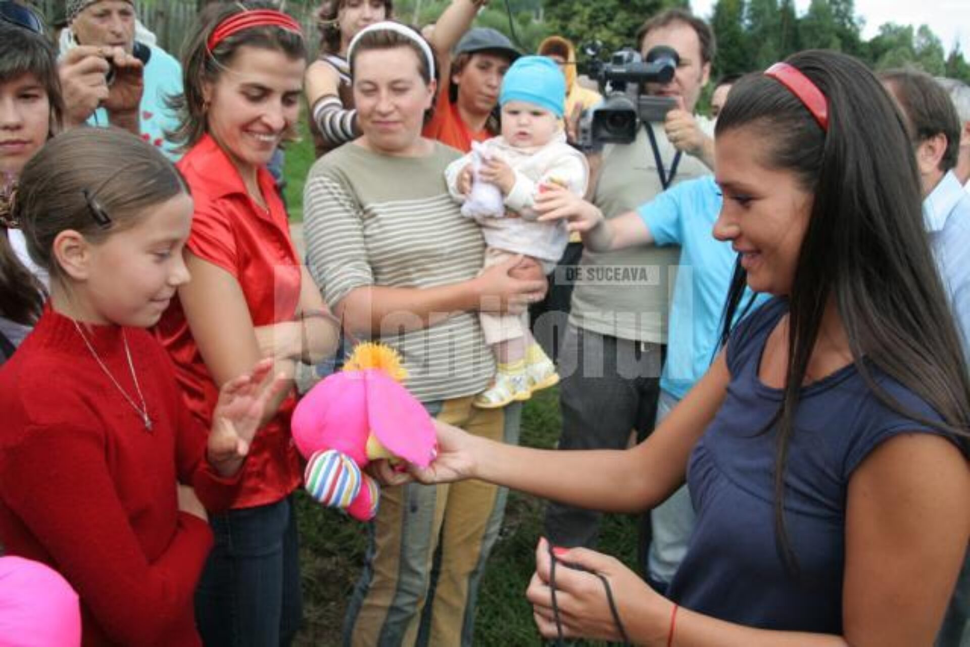 Elena Băsescu s-a îmbrățișat cu câteva dintre femeile sinistrate, după care a împărțit copiilor care erau în zonă jucării de pluș, iar la final s-a fotografiat cu localnicii.
