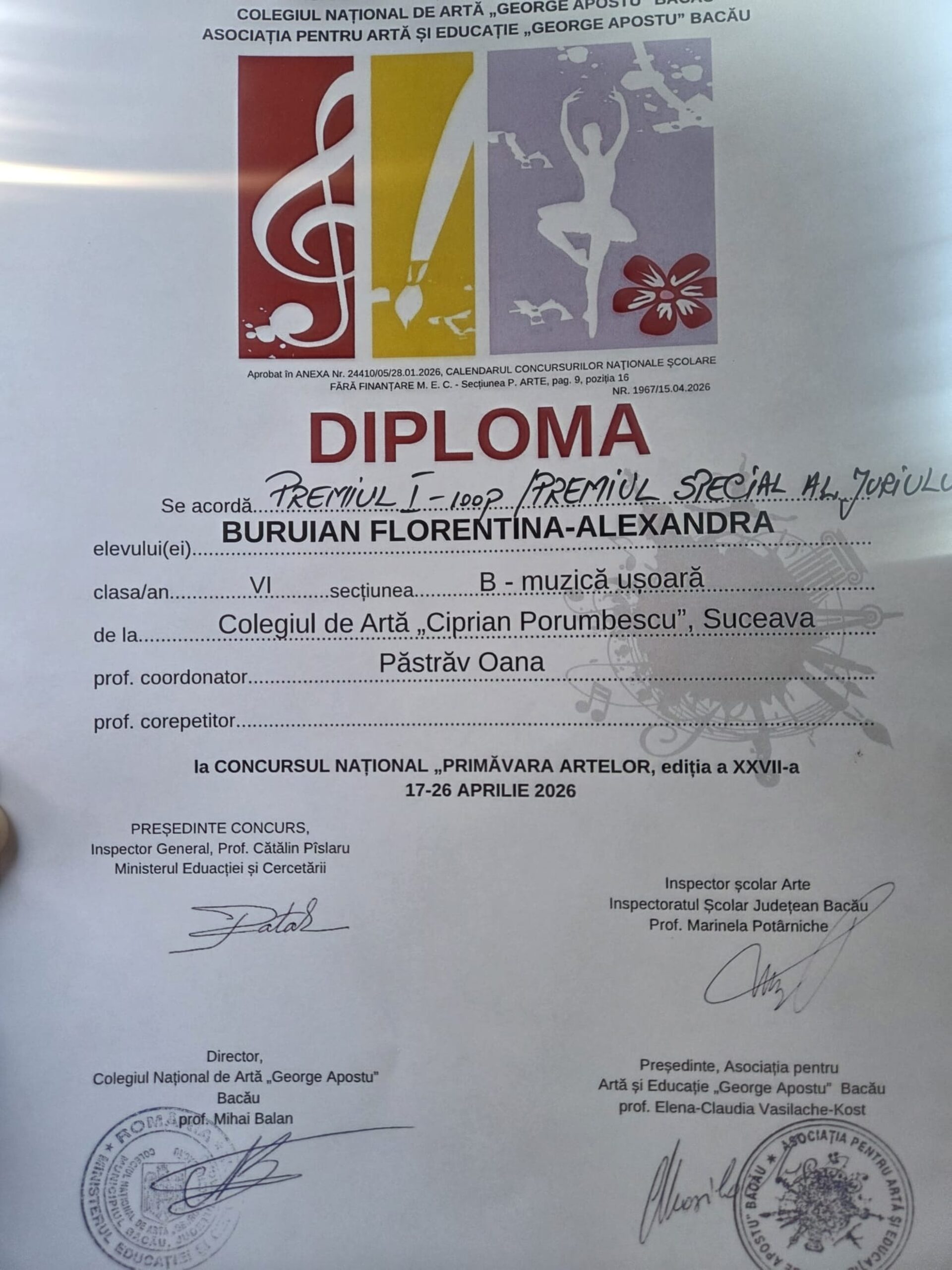 Florentina Alexandra Burian, elevă în clasa a VI-a la Colegiul de Artă „Ciprian Porumbescu” Suceava, a obținut locul I la Concursul Național „Primăvara Artelor”, competiție ce a avut loc recent la Bacău. Suceveanca a primit și premiul special din partea juriului, la secțiunea canto, cu melodia ,,Love in the Dark”, dar și premiul II la secțiunea instrumente de suflat: flaut.