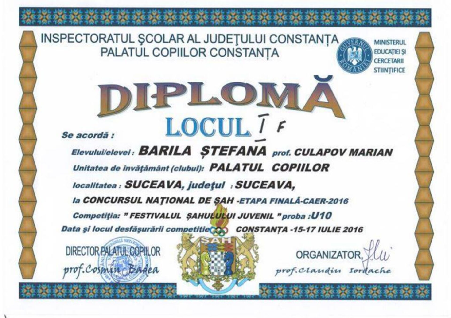 La Palatul Copiilor Constanța s-a desfășurat, în perioada 14-17 iulie, Concursul Regional de Șah „Festivalul Șahului Juvenil”, unde eleva Ștefana Bărîlă de la Palatul Copiilor Suceava a ocupat Locul I la categoria copii sub 10 ani, dintr-un număr total de peste 60 de participanți.