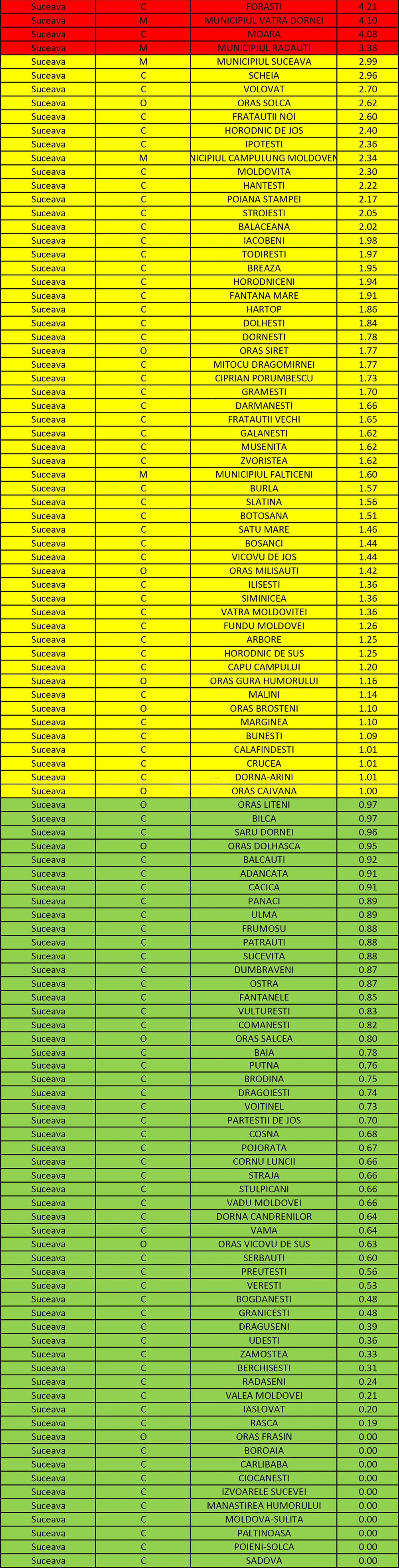 Elevii de gimnaziu și liceu din Vatra Dornei, Rădăuți, Forăști și Moara nu merg la școală începând de luni. Cele patru localități se află în scenariul roșu. Vor face școală fizic doar preșcolarii și elevii din clasele primare.56 de localități sucevene sunt în scenariul verde și 54 în scenariul galben. Vă reamintim scenariile de care se ține cont pentru reîntoarcerea elevilor la școală: Scenariul verde: Participarea zilnică a tuturor preșcolarilor și elevilor în unitățile de învățământ, cu