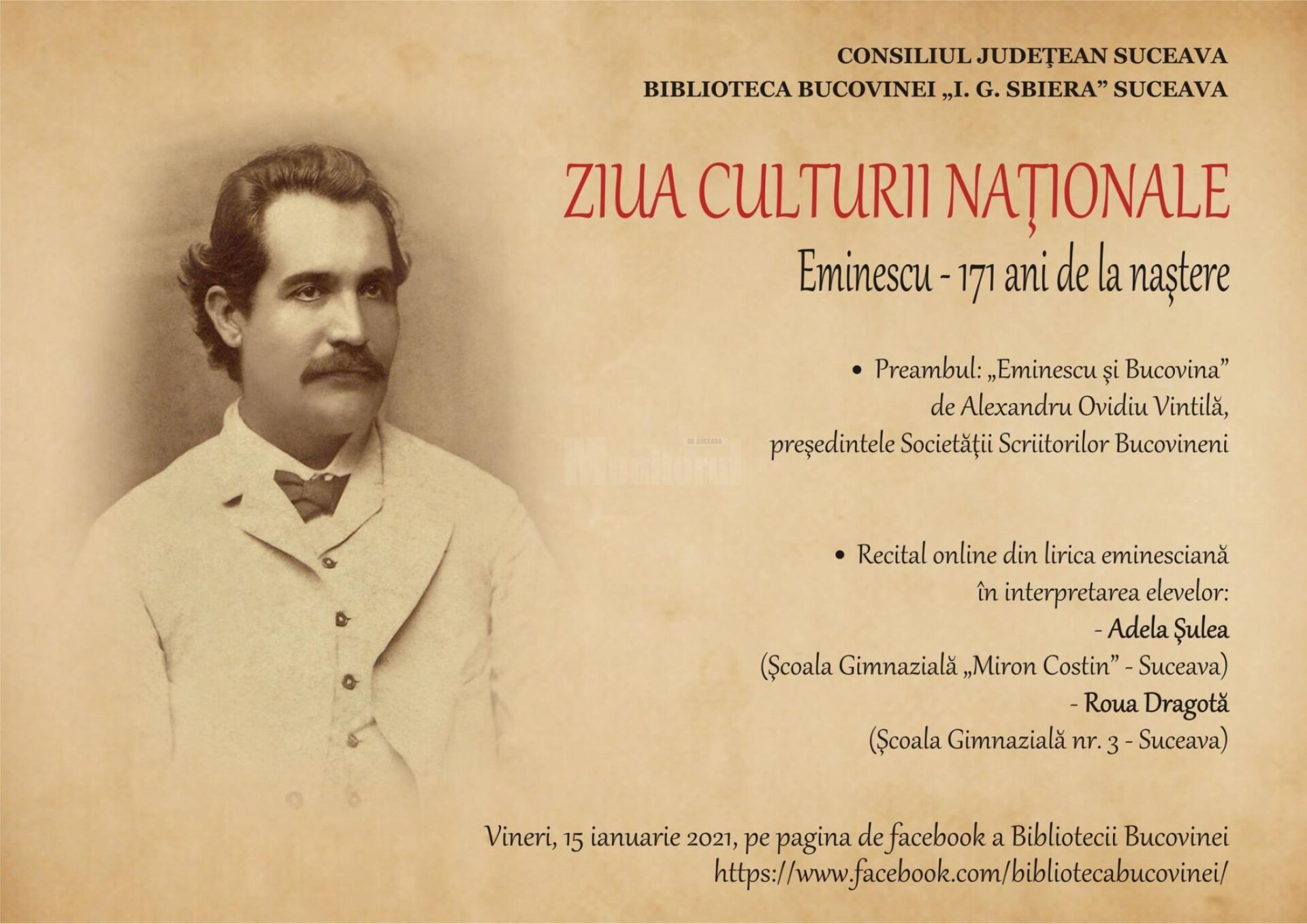 Consiliul Județean Suceava și Biblioteca Bucovinei „I. G. Sbiera” Suceava organizează vineri, 15 ianuarie, de Ziua Culturii Naționale, evenimentul online „Eminescu – 171 de ani de la naștere”.