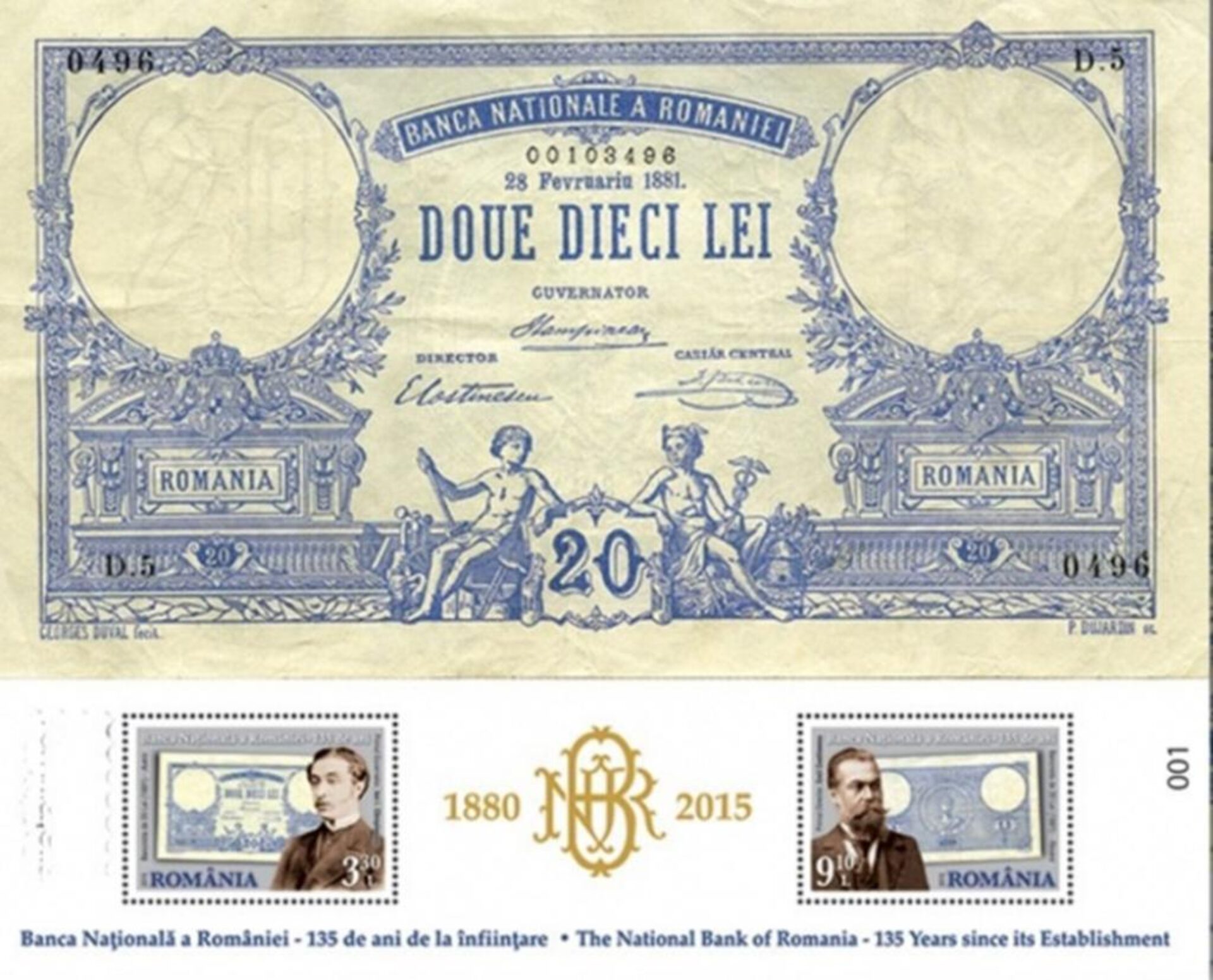 Cele două mărci poștale ale emisiunii reproduc imaginea bancnotei de 20 de lei, emisă la data de 28 februarie 1881 și aflată în patrimoniul Muzeului Național de Istorie a României, împreună cu portretele celor doi semnatari.