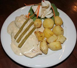 Se taie două tranșe subțiri de piept de pui și se prăjesc ușor la foc mic în unt, apoi se stinge cu vin și se adaugă ½ din cantitatea de sparanghel și se paserează ??? după care se adaugă smântâna și se dă un clocot scurt. La final se decorează cu cealaltă parte de sparanghel. Preparatul poate fi însoțit de garnitură de cartofi la cuptor cu rozmarin și se servește de preferință însoțit de un pahar de vin alb sec bine frapaat.