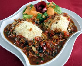 Carnea se trece prin făină cu pesmet și se rumenește în unt iar când carnea este gata puneți pe fiecare bucată bacon, apoi radeți cașcaval și adăugați sosul de legume.