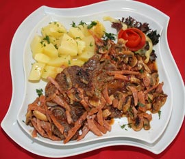 Cotletul format din 2 tranșe îl tragem la tigaie în puțin ulei de măsline, apoi adăugăm șuncă și ciupercile tăiate julien. După care adăugăm vinul demidulce și ketchup-ul.