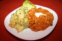 Mușchiul de vită se taie în bucăți mici precum tăițeii. Se încinge untul în tigaie, după care se rumenește carnea. Se adaugă ceapa și usturoiul tocate mărunt, iar după cca. 1 minut se stinge cu supă de oase. Când începe fierberea se adaugă sucul de roșii, smântâna și muștarul. Se lasă la fiert până sosul se leagă (7 – 10 minute) și se condimentează. Se servește cu cartofi piure.