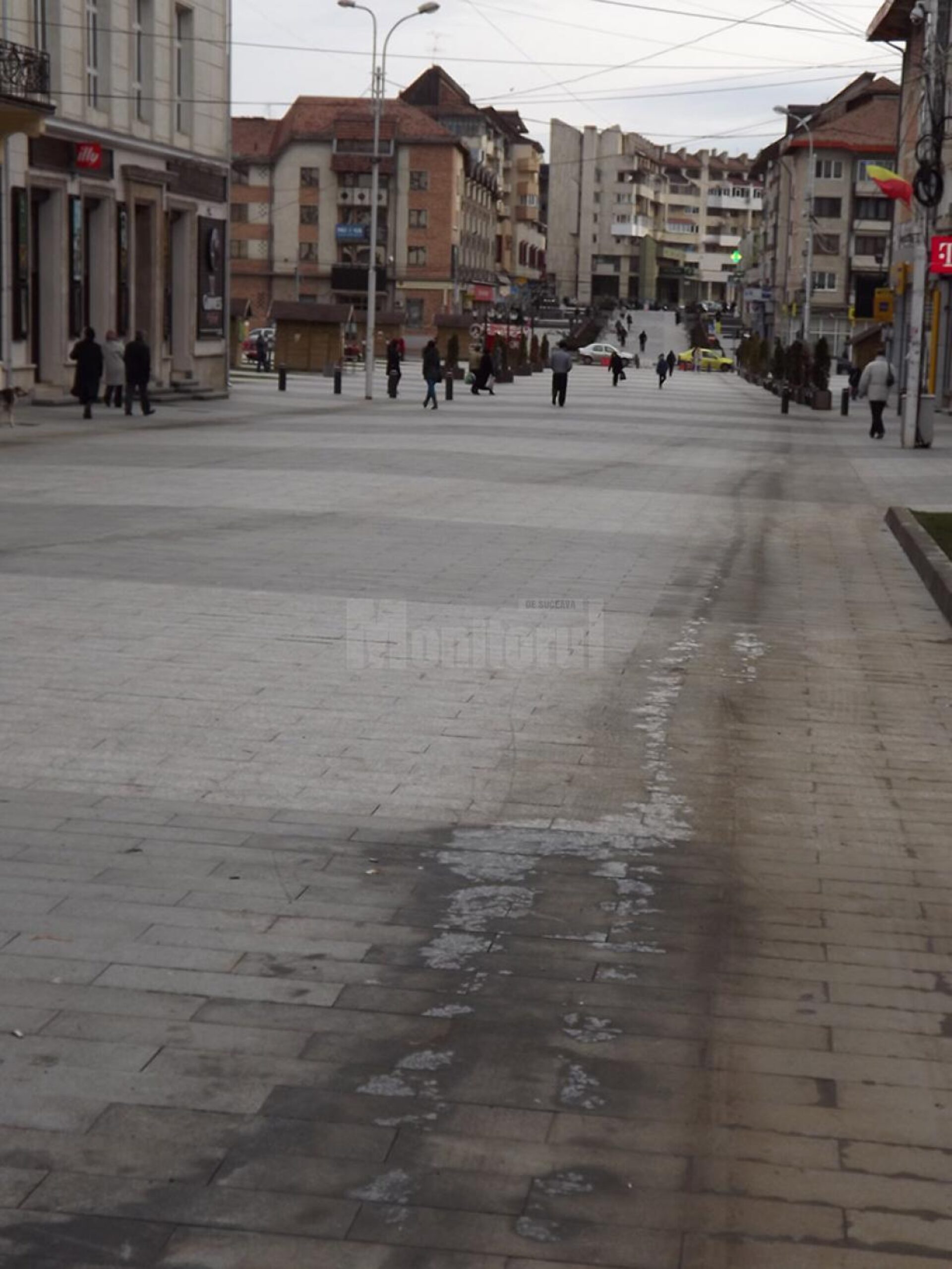 Granitul cu care a fost placată esplanada modernizată din centrul municipiului Suceava este mânjit, de câteva zile, cu lungi dâre de ulei de motor. Începând din zona Parcului Central și până la căsuțele de lemn montate în fața Casei de Cultură, pentru Târgul de Paști, petele de ulei sunt întinse pe suprafețe mari.