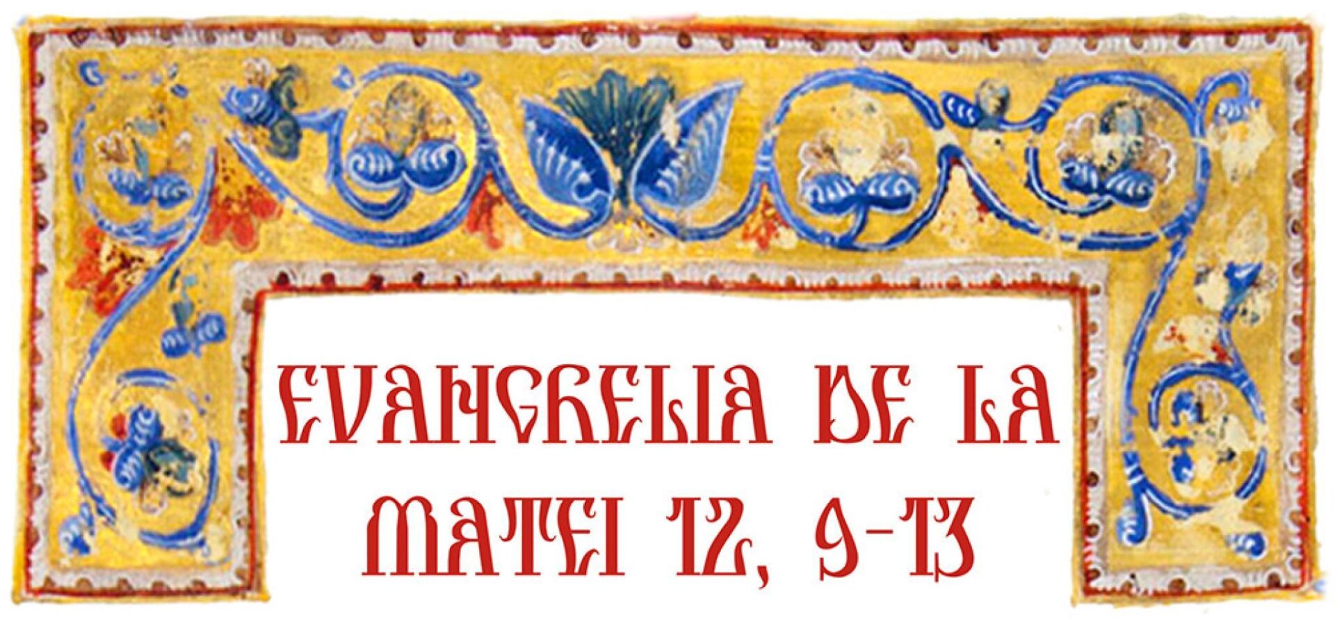 În vremea aceea „plecând de acolo, Iisus a venit în sinagoga lor. Și iată un om având mâna uscată. Și L-au întrebat, zicând: «Cade-se, oare, a vindeca sâmbăta?». Ca să-L învinuiască. El le-a zis: «Cine va fi între voi omul care va avea o oaie și, de va cădea ea sâmbăta în groapă, nu o va apuca și o va scoate? Cu cât mai prețios decât oaia este omul! De aceea se cade a face bine sâmbăta». Atunci i-a zis omului: «Întinde mâna ta. El a întins-o și ea și-a revenit, sănătoasă ca și cealaltă».”