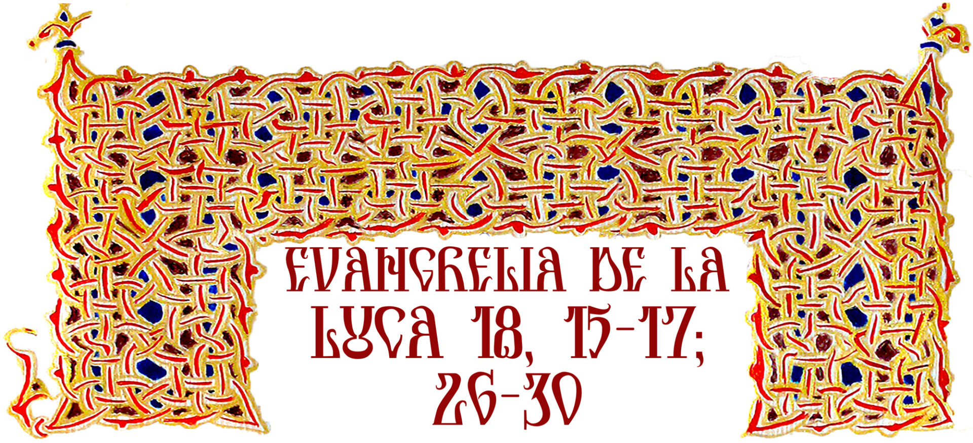 În vremea aceea aduceau la Iisus pruncii, ca să Se atingă de ei. Iar ucenicii, văzând, îi certau. Dar Iisus i-a chemat la Sine, zicând: Lăsați copiii să vină la Mine și nu-i opriți, căci Împărăția lui Dumnezeu este a unora ca aceștia. Adevărat grăiesc vouă: Cine nu va primi Împărăția lui Dumnezeu ca un prunc, nu va intra în ea. Zis-au cei ce ascultau: Și cine poate să se mântuiască? Iar El a zis: Cele ce sunt cu neputință la oameni, sunt cu putință la Dumnezeu. Iar Petru a zis: Iată, noi, lăsând toate ale noastre, am urmat Ție. Și El le-a zis: Adevărat grăiesc vouă: Nu este niciunul care a lăsat casă, sau femeie, sau frați, sau părinți sau copii, pentru Împărăția lui Dumnezeu, și să nu ia cu mult mai mult în vremea aceasta, iar în veacul ce va să vină, viață veșnică.